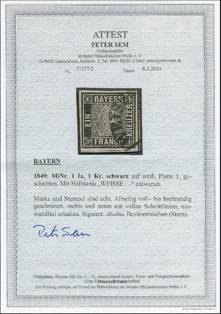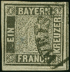 | Zusatzinformationen und Suchstichworte: | Heinrich Köhler 384. Auktion 19./20., 23. - 28. September 2024 Los 3981 Altdeutschland Bayern 1 Kreuzer grauschwarz, Platte 1, farbfrisch und voll- bis breitrandig, entwertet durch Halbkreis "WEISSE…". Einwandfrei. Ausruf 800,00 EUR |