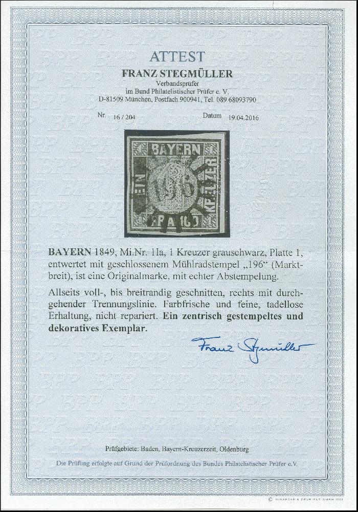 | Zusatzinformationen und Suchstichworte: | Heinrich Köhler 384. Auktion 19./20., 23. - 28. September 2024 Los 3982 Altdeutschland Bayern 1849, 1 Kr. grauschwarz, Platte 1, farbfrisch und voll- bis breitrandig mit durchgehender Trennungslinie rechts, sauber und zentrisch mit Nummer “196” (Marktbreit) entwertet, in tadelloser Erhaltung, ein sehr schönes Exemplar, Ausruf 800,00 EUR |