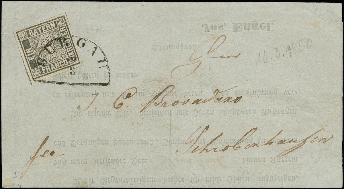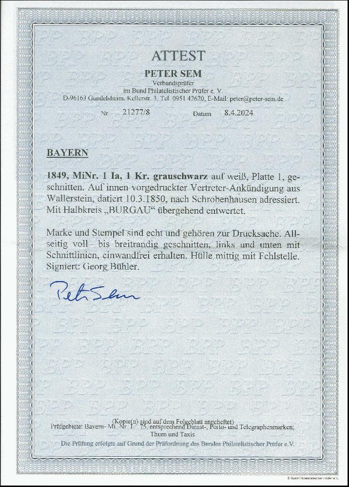 | Zusatzinformationen und Suchstichworte: | Heinrich Köhler 384. Auktion 19./20., 23. - 28. September 2024 Los 3990 Altdeutschland Bayern 1 Kreuzer grauschwarz, Platte 1, farbfrisch und breitrandig, unten und links mit Zwischenlinien, mit klar aufgesetztem Halbkreis "BURGAU ../3" (1850) auf vollständiger Drucksache aus Wallerstein, nach Schrobenhausen. Im Briefpapier vorderseitig unauffällige Fehlstelle, sonst einwandfrei. Ausruf 1.800,00 EUR |