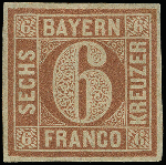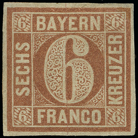 | Zusatzinformationen und Suchstichworte: | Heinrich Köhler 384. Auktion 19./20., 23. - 28. September 2024 Los 4004 Altdeutschland Bayern 6 Kr. braunorange, farbfrisch und voll- bis breitrandig, ungebraucht mit kleinem Teil Fremdgummi. Kleine Hinterlegung und punkthelle Stelle, sonst einwandfrei. Ein sehr attraktives Stück dieser ungebraucht äußerst seltenen Marke. Ausruf 1.000,00 EUR |