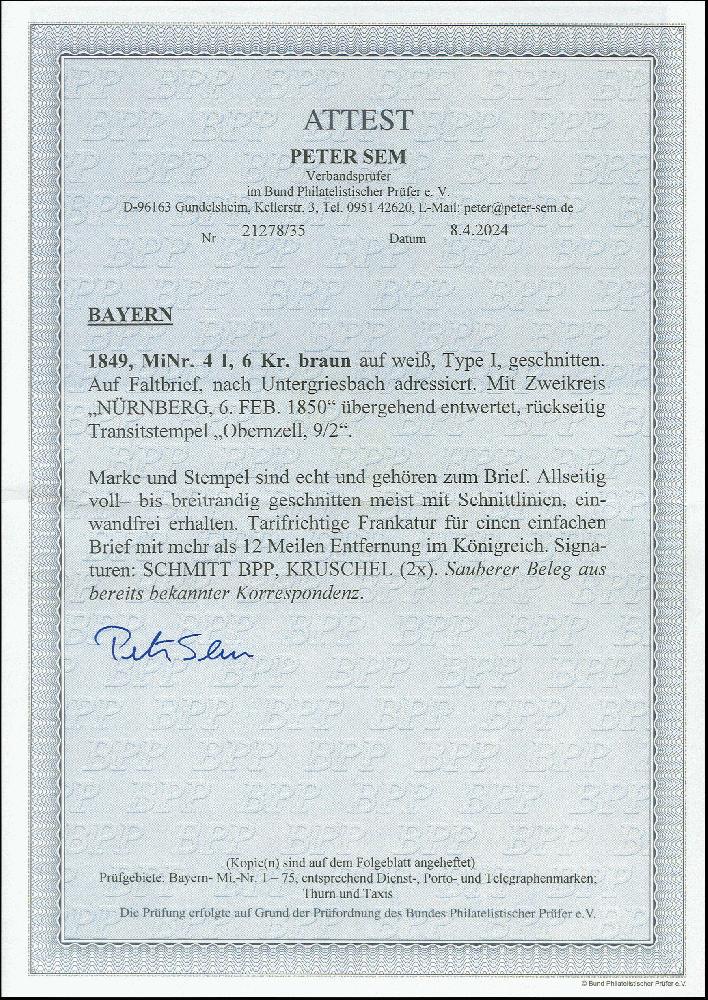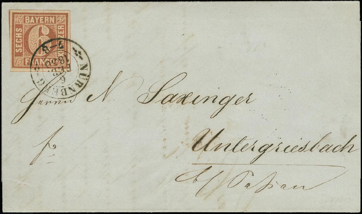 | Zusatzinformationen und Suchstichworte: | Heinrich Köhler 384. Auktion 19./20., 23. - 28. September 2024 Los 4011 Altdeutschland Bayern 6 Kr. braunorange, farbfrisch und voll- bis meist breitrandig, mit fast vollständigen Zwischenlinien, mit klar aufgesetztem DKr. "NÜRNBERG 6 FEB. 1850" auf komplettem Faltbrief nach Untergriesbach. Ein attraktiver Brief in tadelloser Erhaltung. Ausruf 300,00 EUR |