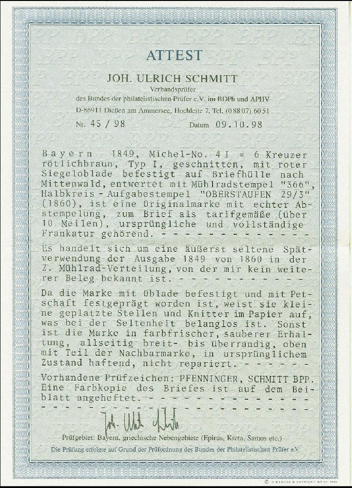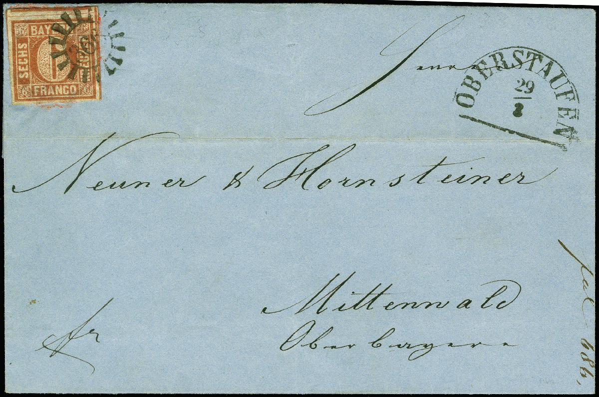 | Zusatzinformationen und Suchstichworte: | Heinrich Köhler 384. Auktion 19./20., 23. - 28. September 2024 Los 4010 Altdeutschland Bayern 6 Kreuzer braunorange, breit- bis überrandig mit Zwischenlinien an drei Seiten und oben Teil der Nachbarmarke, mit roter Siegeloblate mittels einer Petschaft auf Briefhülle befestigt, entwertet mit gMR "366" und klar nebengesetztem Halbkreisstempel "OBERSTAUFEN 29/3", adressiert an die Geigenbauer Neuner und Hornsteiner in Mittenwald. Aufgrund der Befestigungsart ist die Marke sehr starr und weist diverse Knitter auf, das Briefpapier im Bereich der Marke etwas aufgespalten, sonst tadellose und frische Erhaltung. Eine bedeutende Seltenheit der Bayern-Philatelie; wir haben nur einen weiteren Brief mit einer Spätverwendung dieser Marke während der zweiten Stempelverteilung registriert. Ausruf 2.000,00 EUR |