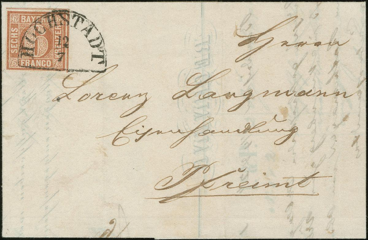 | Zusatzinformationen und Suchstichworte: | Heinrich Köhler 384. Auktion 19./20., 23. - 28. September 2024 Los 4012 Altdeutschland Bayern 6 Kr. braunorange, farbfrisch und breitrandig, mit sauber übergehend aufgesetztem Halbkreis "HOCHSTADT 12/7" (1850) auf komplettem Faltbrief nach Pfreimt. Schöne frische und einwandfreie Erhaltung Ausruf 200,00 EUR |