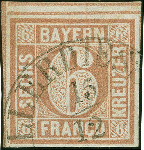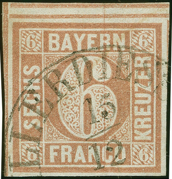 | Zusatzinformationen und Suchstichworte: | Heinrich Köhler 384. Auktion 19./20., 23. - 28. September 2024 Los 4014 Altdeutschland Bayern 6 Kr. braunorange, farbfrisch und voll- bis meist breitrandig, oben mit doppelter Trennungslinie (kleiner Zwischensteg), sauber entwertet durch Halbkreisstempel von Illerdiessen. Tadellos. Ausruf 150,00 EUR |