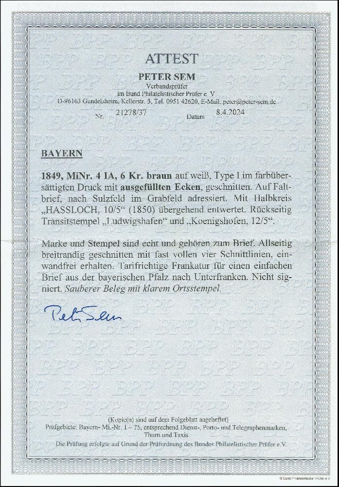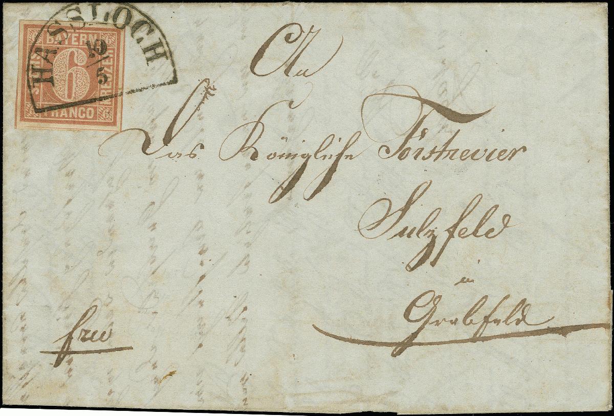 | Zusatzinformationen und Suchstichworte: | Heinrich Köhler 384. Auktion 19./20., 23. - 28. September 2024 Los 4015 Altdeutschland Bayern 6 Kr. braunorange mit ausgefüllten Ecken, farbfrisch und breitrandig, mit fast vollständigen Zwischenlinien, mit klar aufgesetztem Halbkreis "HASSLOCH 10/5"(1850) auf komplettem Faltbrief nach Sulzfeld. Ein sehr schöner Brief in tadelloser Erhaltung. Ausruf 300,00 EUR |