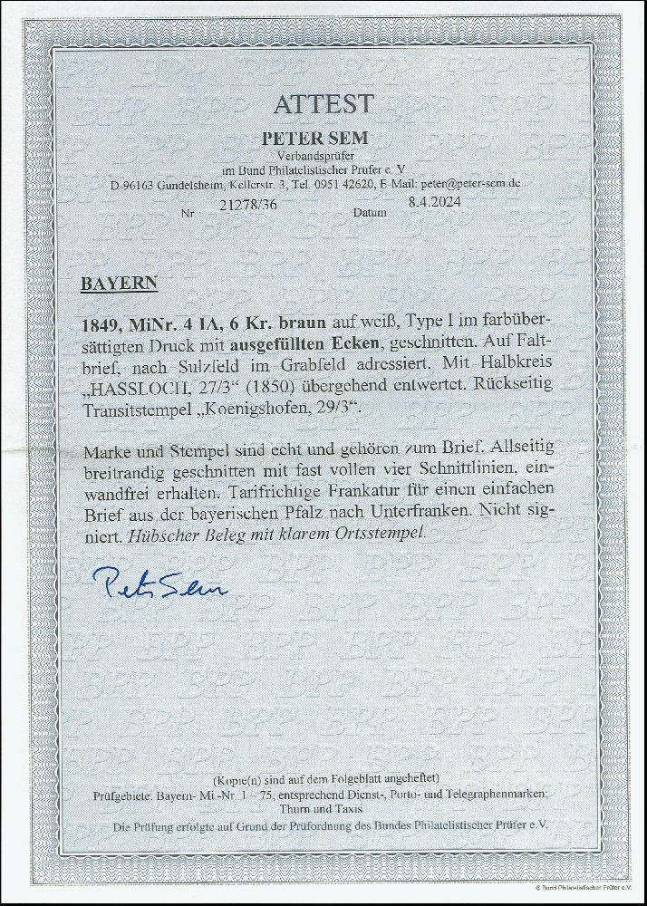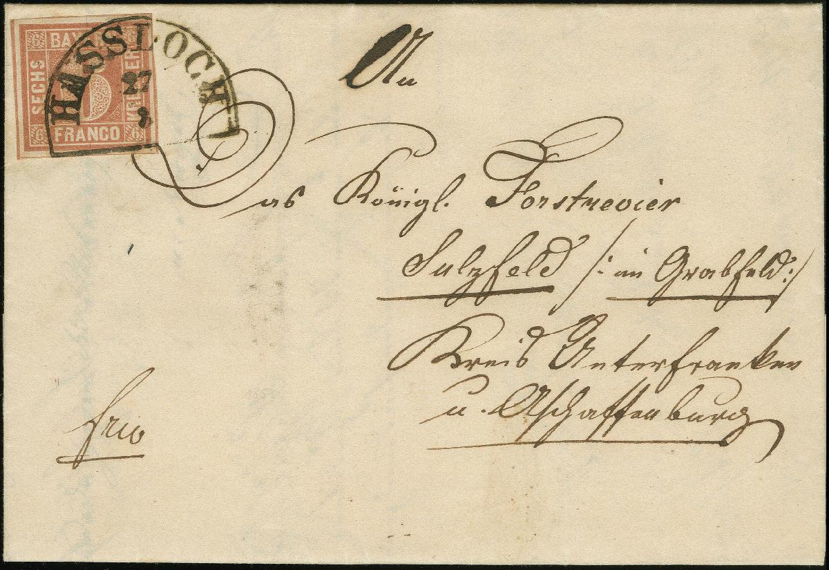 | Zusatzinformationen und Suchstichworte: | Heinrich Köhler 384. Auktion 19./20., 23. - 28. September 2024 Los 4016 Altdeutschland Bayern 6 Kr. braunorange mit ausgefüllten Ecken, farbfrisch und breitrandig, mit fast vollständigen Zwischenlinien, mit klar aufgesetztem Halbkreis "HASSLOCH 27/3"(1850) auf komplettem Faltbrief nach Sulzfeld. Ein sehr schöner Brief in tadelloser Erhaltung. Ausruf 300,00 EUR |