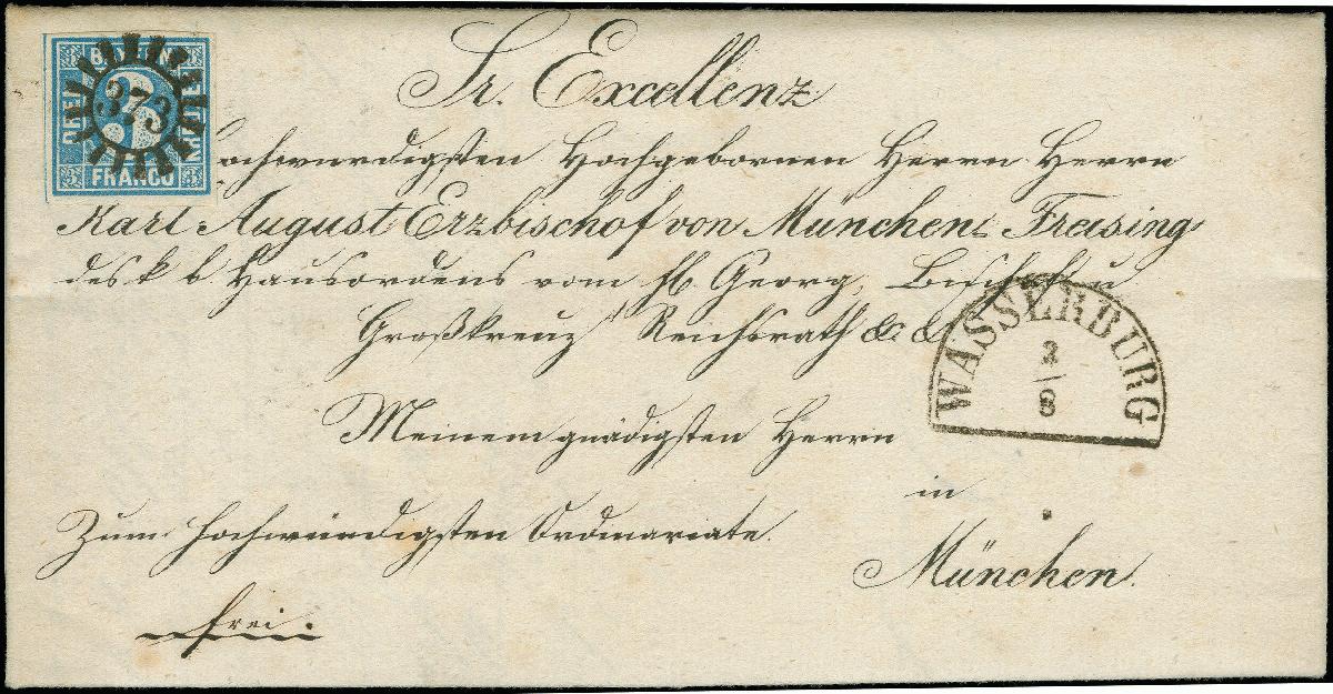 | Zusatzinformationen und Suchstichworte: | Heinrich Köhler 384. Auktion 19./20., 23. - 28. September 2024 Los 4022 Altdeutschland Bayern 3 Kr. blau, Platte 2, voll- bis breitrandig, mit klar und zentrisch aufgesetztem gMR. "373" und sauber nebengesetztem Halbkreis "WASSERBURG 3/8" (1854) auf Bischofsbrief mit komplettem Inhalt an Karl August in München. Ein sehr schönes und mit Inhalt seltenes Stück in tadelloser Erhaltung. Ausruf 100,00 EUR |
