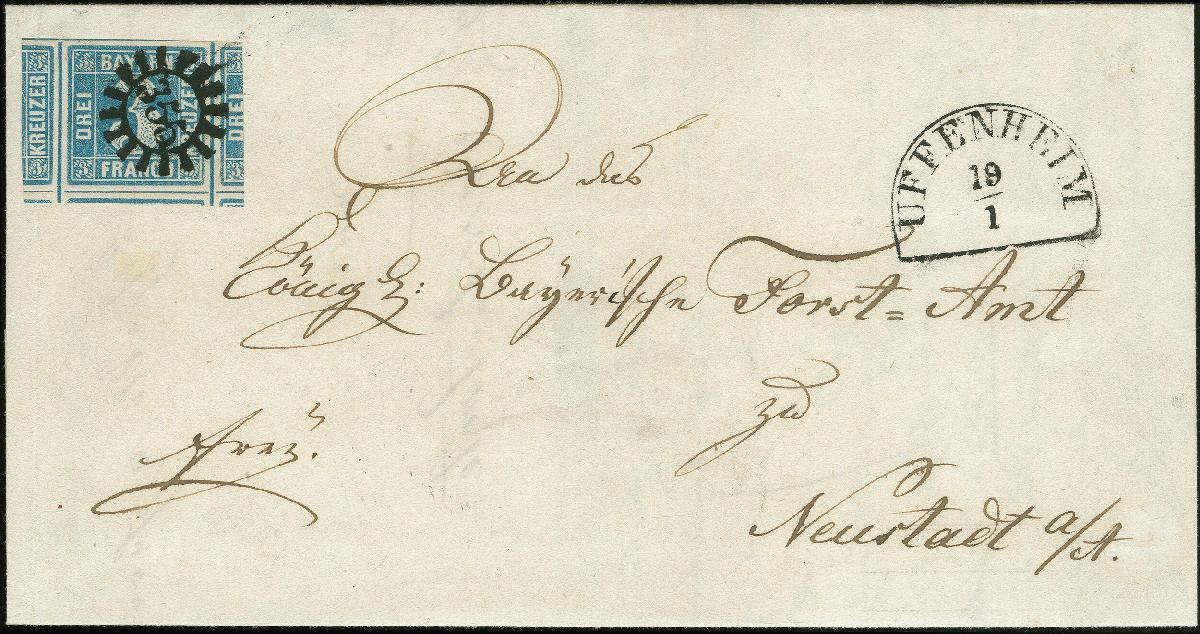 | Zusatzinformationen und Suchstichworte: | Heinrich Köhler 384. Auktion 19./20., 23. - 28. September 2024 Los 4023 Altdeutschland Bayern 3 Kr. blau, Platte 2, breit - bis überrandig, mit teils großen Teilen von 5 Nachbarmarken, mit klar aufgesetztem gMR. "355" und sauber nebengesetztem Halbkreis "UFFENHEIM 19/1" auf Briefhülle nach Neustadt. Ein außergewöhnliches Stück in tadelloser Erhaltung. Ausruf 100,00 EUR |