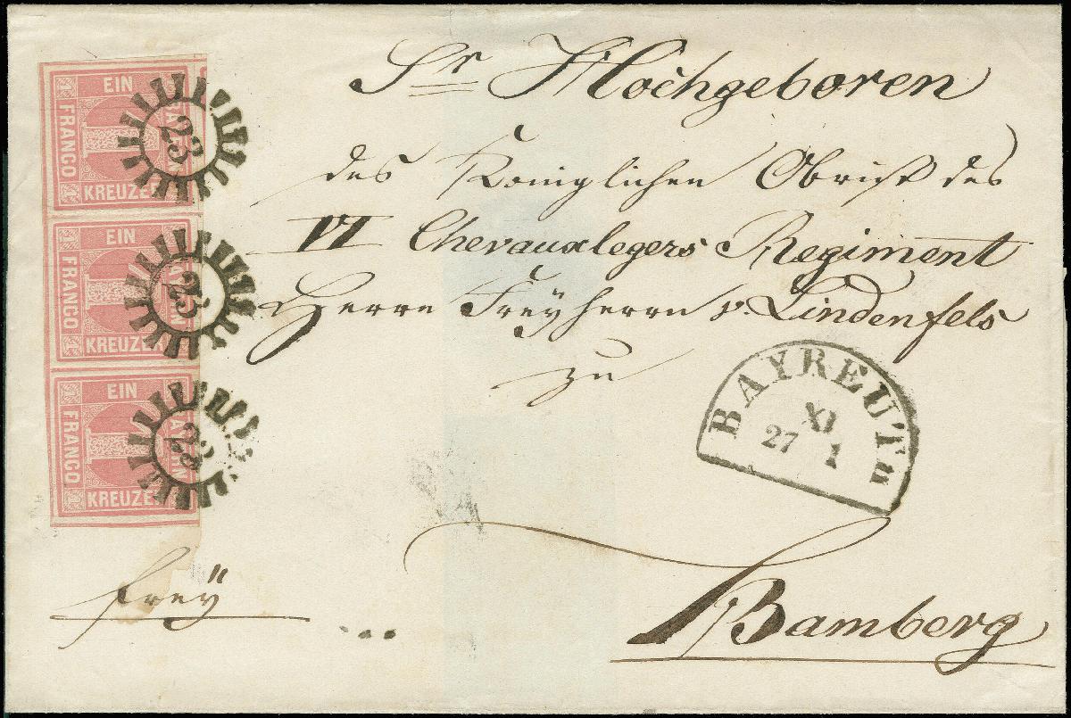 | Zusatzinformationen und Suchstichworte: | Heinrich Köhler 384. Auktion 19./20., 23. - 28. September 2024 Los 4030 Altdeutschland Bayern 1 Kr. rosa, waagerechter Dreierstreifen, rechts oben gut voll- sonst breit- bis überrandig, mit fast vollständigen Schnittlinien, mit jeweils übergehend sauber aufgesetztem gMR "23" und sauber nebengesetztem Halbkreis "BAYREUTH 27/1" auf Briefkuvert mit dekorativer Militär-Adresse nach Bamberg. Ein besonders attraktiver Brief in einwandfreier Erhaltung. Ausruf 150,00 EUR |