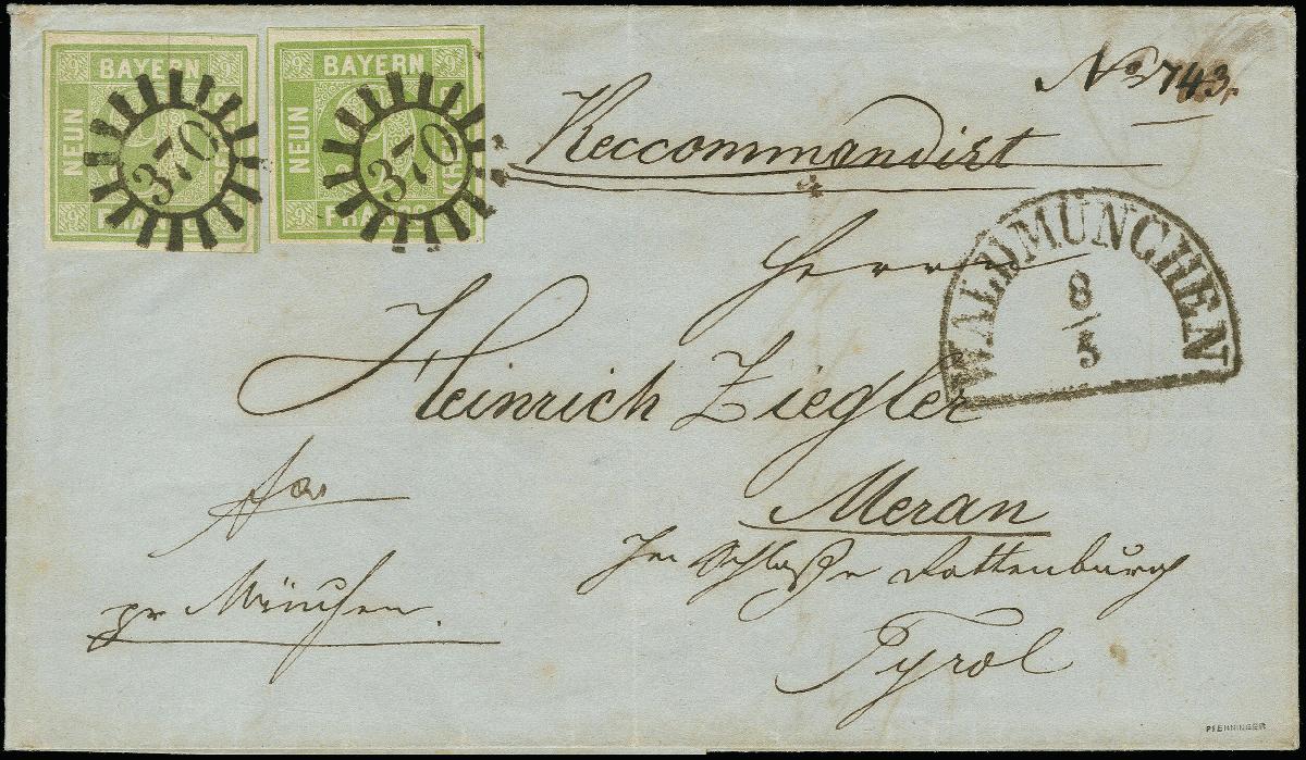 | Zusatzinformationen und Suchstichworte: | Heinrich Köhler 384. Auktion 19./20., 23. - 28. September 2024 Los 4036 Altdeutschland Bayern 9 Kr. maigrün, 2 Einzelwerte in unterschiedlichen Nuancen, beide farbfrisch und voll- bis meist breitrandig, mit jeweils klar aufgesetztem gMR "370" und sauber nebengesetztem Halbkreis "WALDMÜNCHEN 8/5" (1853) auf eingeschriebener Briefhülle nach Meran in Tirol. Ein attraktiver Brief im Wechselverkehr mit Österreich. Einwandfrei. Ausruf 200,00 EUR |