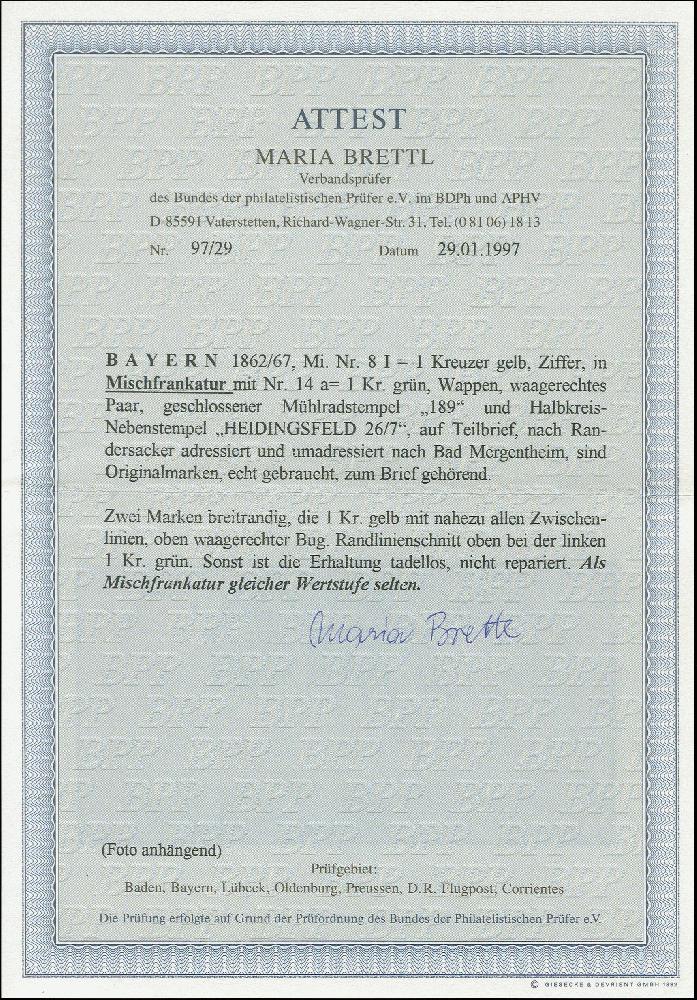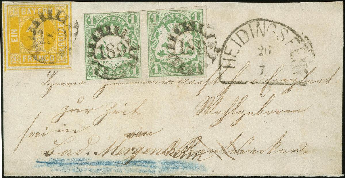 | Zusatzinformationen und Suchstichworte: | Heinrich Köhler 384. Auktion 19./20., 23. - 28. September 2024 Los 4047 Altdeutschland Bayern 1 Kr. gelb, Type I, allseits breitrandig, mit nahezu allen Zwischenlinien, mit gMR "189" und sauber nebengesetztem Halbkreis "HEIDINGSFELD 26/7" auf nicht kompletter Briefhülle (Vorderseite und Rückklappe mit Ankunftsstempel) nach Randersacker im Nahbereich. Da der Adressat verreist war, wurde der Brief retourniert, auffrankiert mit waagerechtem Paar 1867, Wappen 1 Kreuzer grün (ein Wert Randlinienschnitt oben), und umadressiert nach Bad Mergentheim. Die Einzelmarke unmerkliche Bugspur , sonst einwandfrei. Eine seltene wertstufengleiche Mischfrankatur. Ausruf 700,00 EUR |