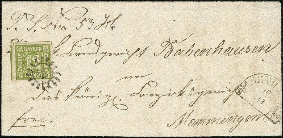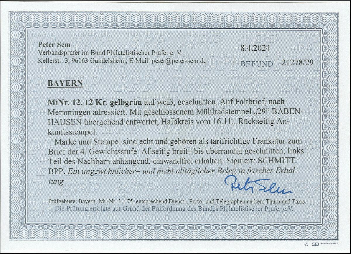 | Zusatzinformationen und Suchstichworte: | Heinrich Köhler 384. Auktion 19./20., 23. - 28. September 2024 Los 4054 Altdeutschland Bayern 12 Kreuzer grün, allseits breit- bis überrandig, mit Teil der linke Nachbarmarke, mit klar aufgesetztem gMR "29" und sauber nebengesetztem Halbkreis "BABENHAUSEN 16/11" auf Gerichtsbrief der 4. Gewichtsstufe nach Memmingen. Schöne und einwandfreie Erhaltung Ausruf 150,00 EUR |