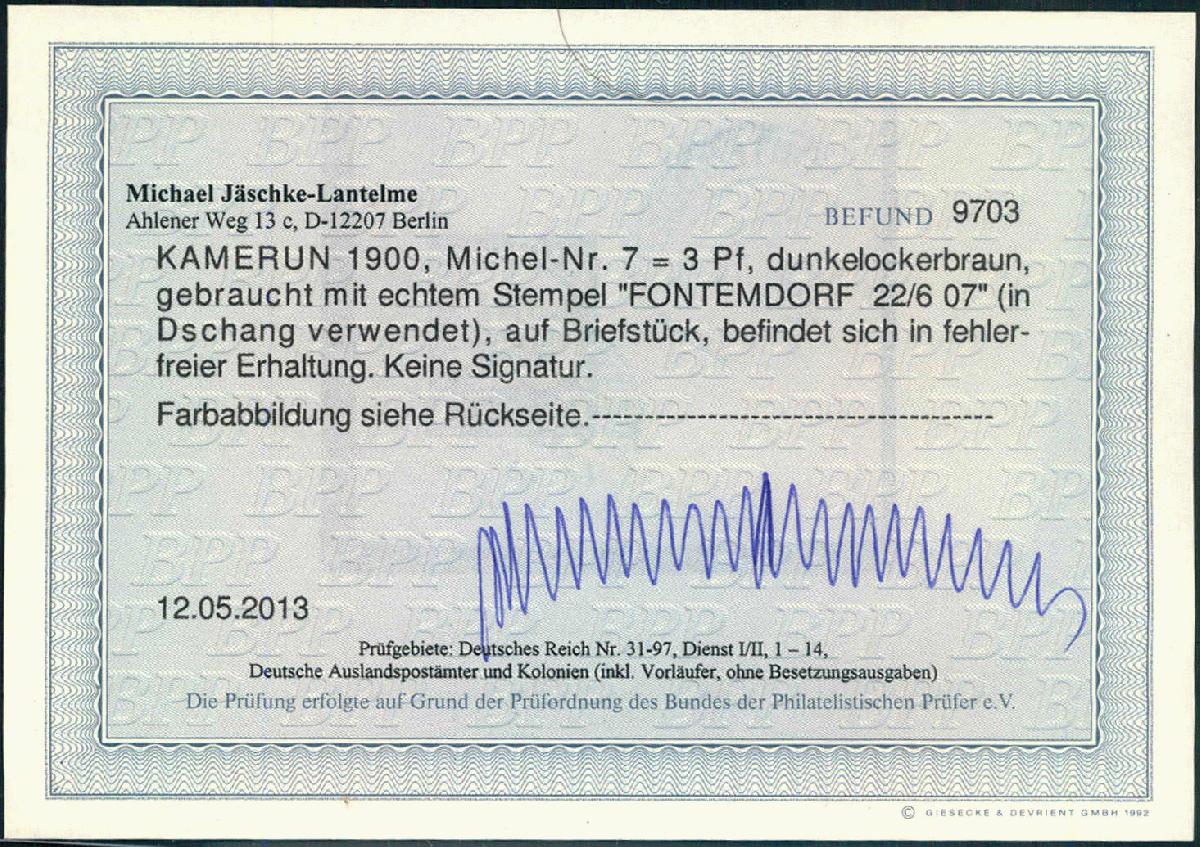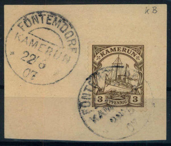 | Zusatzinformationen und Suchstichworte: | Briefmarken Fischer Shop Los 0000415171 Deutsche Kolonien Kamerun "FONTEMDORF", guter K1 zweimal klar auf 3 Pf. Schiffe, in Dschang am 22.6.07 verwendet, Befund Jäschke-L. "FEHLERFREIE ERHALTUNG" Festpreis 100,00 EUR |