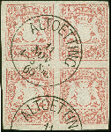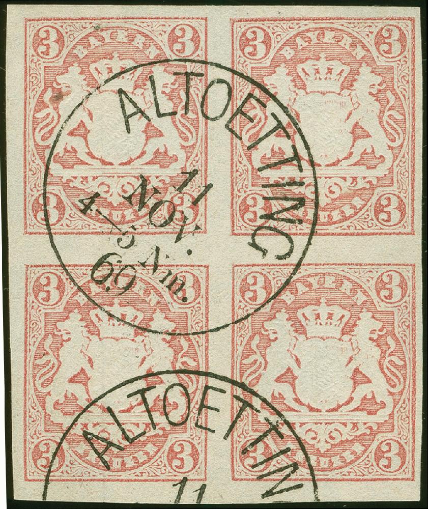 | Zusatzinformationen und Suchstichworte: | Heinrich Köhler 384. Auktion 19./20., 23. - 28. September 2024 Los 4058 Altdeutschland Bayern 3 Kr. karminrosa im Viererblock, farbfrisch und gut voll- bis meist breitrandig, mit klar aufgesetztem EKr. "ALTOETTING 11 NOV. 69". Tadellos. Eine, insbesondere mit der Ortsstempelentwertung, seltene Einheit. Ausruf 300,00 EUR |