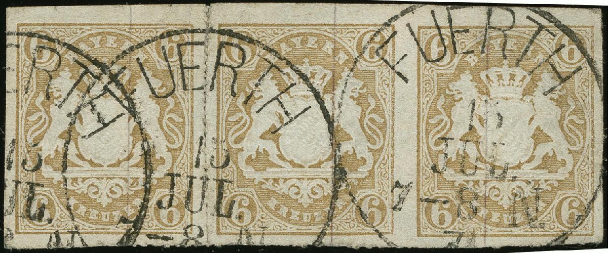 | Zusatzinformationen und Suchstichworte: | Heinrich Köhler 384. Auktion 19./20., 23. - 28. September 2024 Los 4066 Altdeutschland Bayern 6 Kreuzer ockerbraun im waagerechten 3er-Streifen, voll- bis meist breitrandig, mit privaten Durchstich (nicht prüfbar), sauber entwertet durch Einkreisstempel "FUERTH 15 JUL.". Die linke Marke minimale Knitterspuren, die rechte etwas falzhell und Seidenfadenfehler, sonst tadellos. Eine seltene Einheit. Ausruf 200,00 EUR |