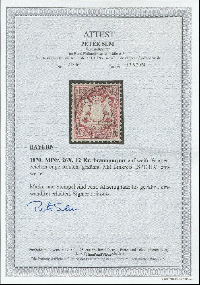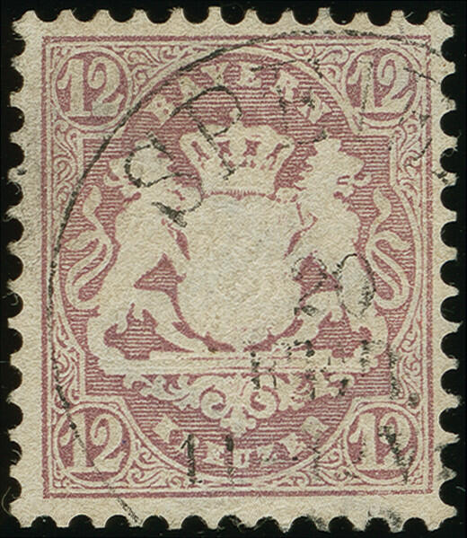 | Zusatzinformationen und Suchstichworte: | Heinrich Köhler 384. Auktion 19./20., 23. - 28. September 2024 Los 4075 Altdeutschland Bayern 12 Kr. lila mit Wz. 'enge Rauten', farbfrisch und einwandfrei gezähnt, sauber entwertet durch EKr. von Speyer. Tadellos. Ausruf 300,00 EUR |