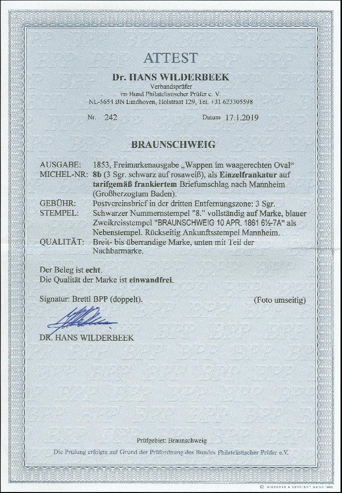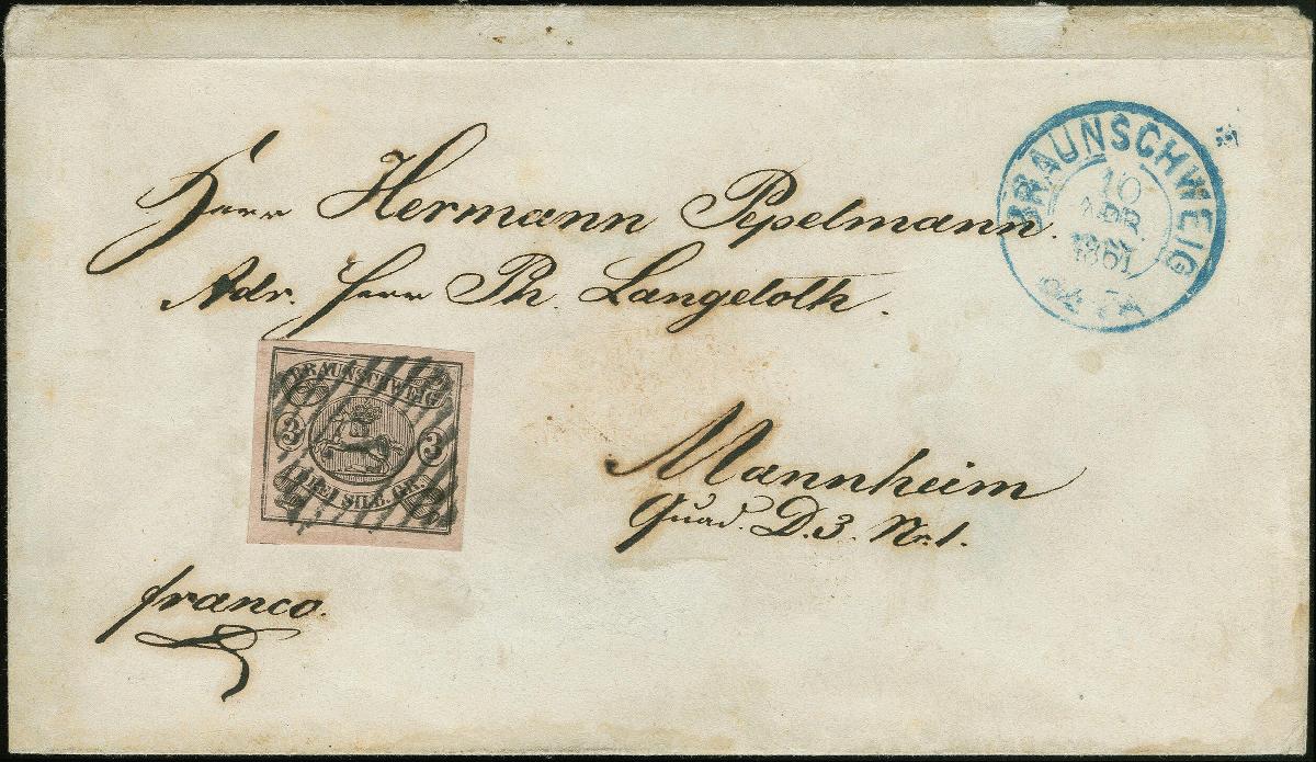 | Zusatzinformationen und Suchstichworte: | Heinrich Köhler 384. Auktion 19./20., 23. - 28. September 2024 Los 4095 Altdeutschland Braunschweig 1853, 3 Sgr. auf rosaweiß, farbfrisch und allseits breit- bis überrandig geschnitten, sauber mit Nummernstempel “8” und nebengesetztem DKr. “BRAUNCSHWEIG 10 APR 1861” auf Briefkuvert nach Mannheim, das Kuvert gering unfrisch, sonst tadellos Ausruf 100,00 EUR |