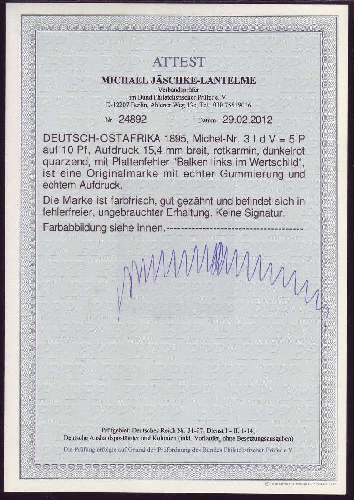 | Prüfer: | Jäschke-Lantelme, Michael (BPP (Bund Philatelistischer Prüfer)) |