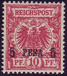 | Zusatzinformationen und Suchstichworte: | Christian E. Geigle Briefmarkenfachhandel Los 0002023123 Deutsche Kolonien Ostafrika 1893/96, 5 P auf 10 Pfg. rotkarmin, ungebrauchtes Luxusstück dieser sehr seltenen Farbe in Aufdrucktype I (15,4 mm breit) mit Originalgummierung und Falzrest, Plattenfehler "Balken links im Wertschild" besonders farbfrisch und gut gezähnt, unsigniert mit FA Jäschke-Lantelme "fehlerfrei". Festpreis 575,00 EUR |