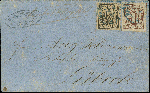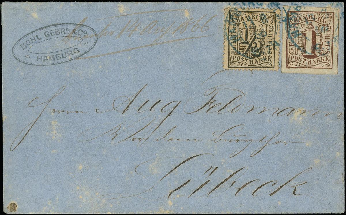 | Zusatzinformationen und Suchstichworte: | Heinrich Köhler 384. Auktion 19./20., 23. - 28. September 2024 Los 4111 Altdeutschland Hamburg 1859, 1 Sch. dunkelrotbraun in Mischfrankatur mit 1864 ½ Schilling schwarz gezähnt, beide farbfrisch, sehr breitrandig geschnitten bzw. gut gezähnt, sauber mit DKr. “HAMBURG ST.P. 13 8 66 6-7N.” auf Faltbriefhülle nach Lübeck mit rückseitigem Ausgabestempel. Die Frankatur winzig altersfleckig, 1 Sch. mit senkrechtem Bug, die Faltbriefhülle mit Altersspuren, eine große Frankaturseltenheit, wir haben lediglich zwei weitere Mischfrankaturen der geschnittenen und gezähnten Ausgabe registriert, in dieser Kombination einzigartig, Ausruf 1.000,00 EUR |
