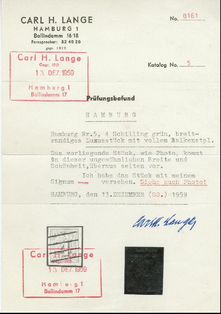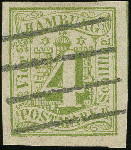 | Zusatzinformationen und Suchstichworte: | Heinrich Köhler 384. Auktion 19./20., 23. - 28. September 2024 Los 4112 Altdeutschland Hamburg 1859, 4 Sch. dunkelgelblichgrün, farbfrisch und allseits breitrandig geschnitten, sauber mit Vierstrichstempel entwertet, tadellos, ein besonders schönes Stück dieser seltenen Marke, Ausruf 400,00 EUR |