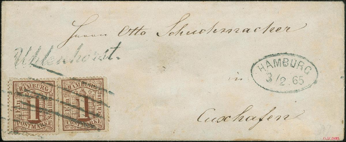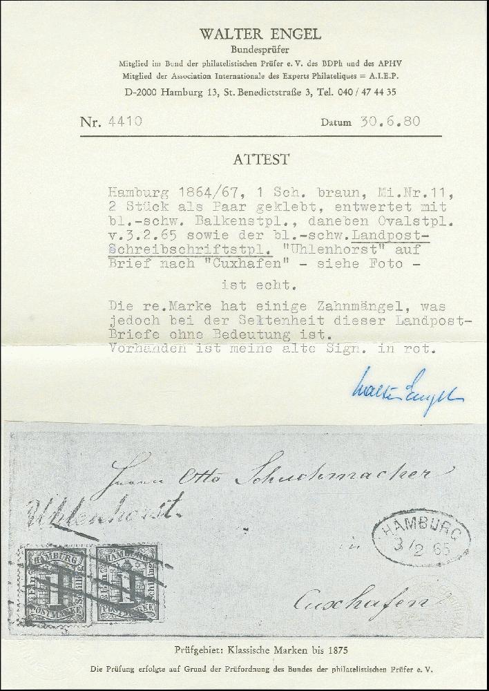 | Zusatzinformationen und Suchstichworte: | Heinrich Köhler 384. Auktion 19./20., 23. - 28. September 2024 Los 4120 Altdeutschland Hamburg "Uhlenhorst", L1 in bläulichschwarz, sauber nebengesetzt auf kleinem Briefkuvert mit 2 Einzelwerten 1 Schilling braun (ein Wert teils Scherentrennung), mit sauber aufgesetztem Strichstempel und nebengesetztem Ovalstempel "HAMBURG 3/2.65", nach Cuxhaven. Ausruf 200,00 EUR |