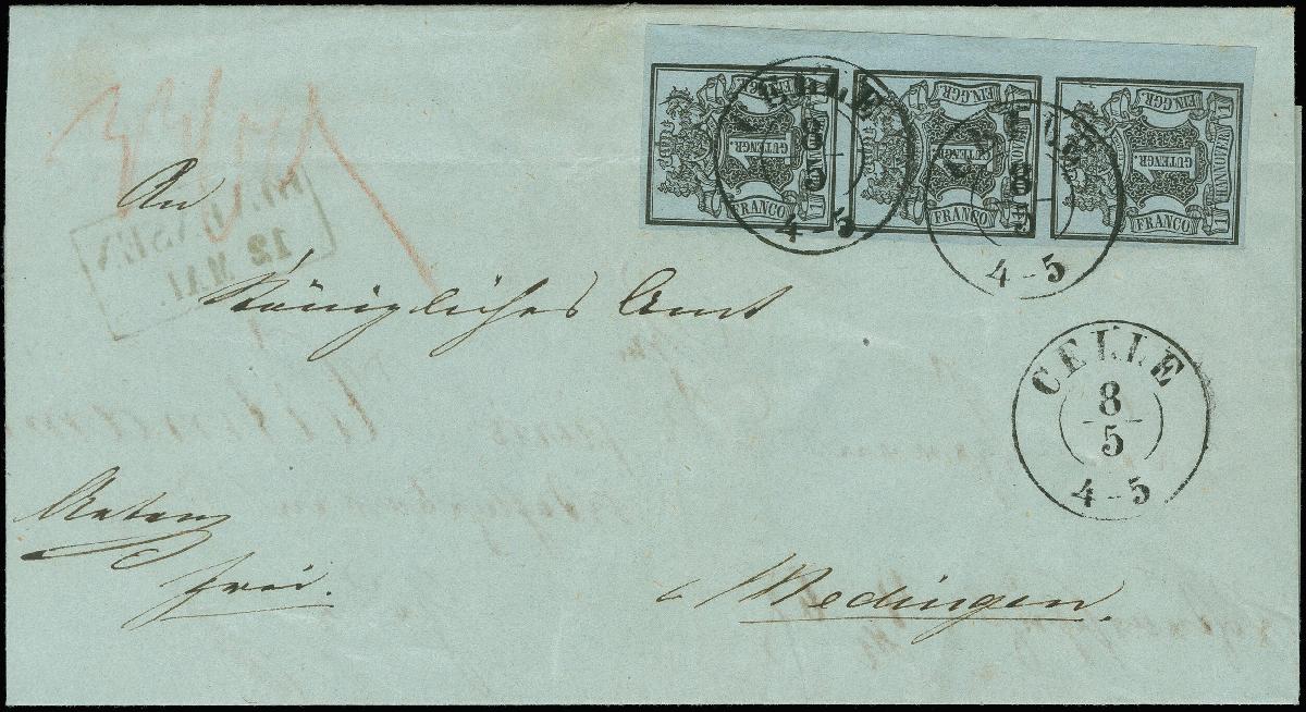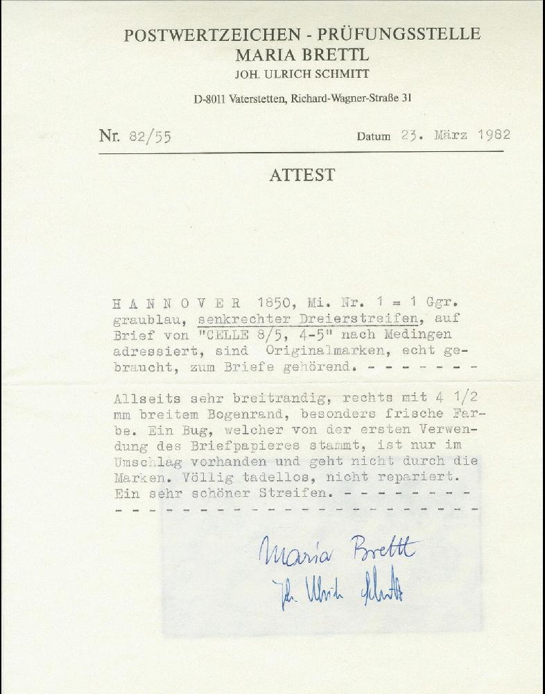 | Zusatzinformationen und Suchstichworte: | Heinrich Köhler 384. Auktion 19./20., 23. - 28. September 2024 Los 4127 Altdeutschland Hannover 1 Ggr. a. graublau im senkrechten 3er-Streifen, voll- bis breitrandig, rechts mit ca. 4 mm Bogenrand, mit klar auf- und nebengesetztem schwarzen DKr. "CELLE 8/5" auf doppelt verwendeter Briefhülle nach Meidingen. Durch die Einheit verläuft eine schwache senkrechte Druckspur, wo sie über die Briefkante der ersten Verwendung geklebt wurde. Ein sehr attraktiver und seltener Brief. Ausruf 800,00 EUR |