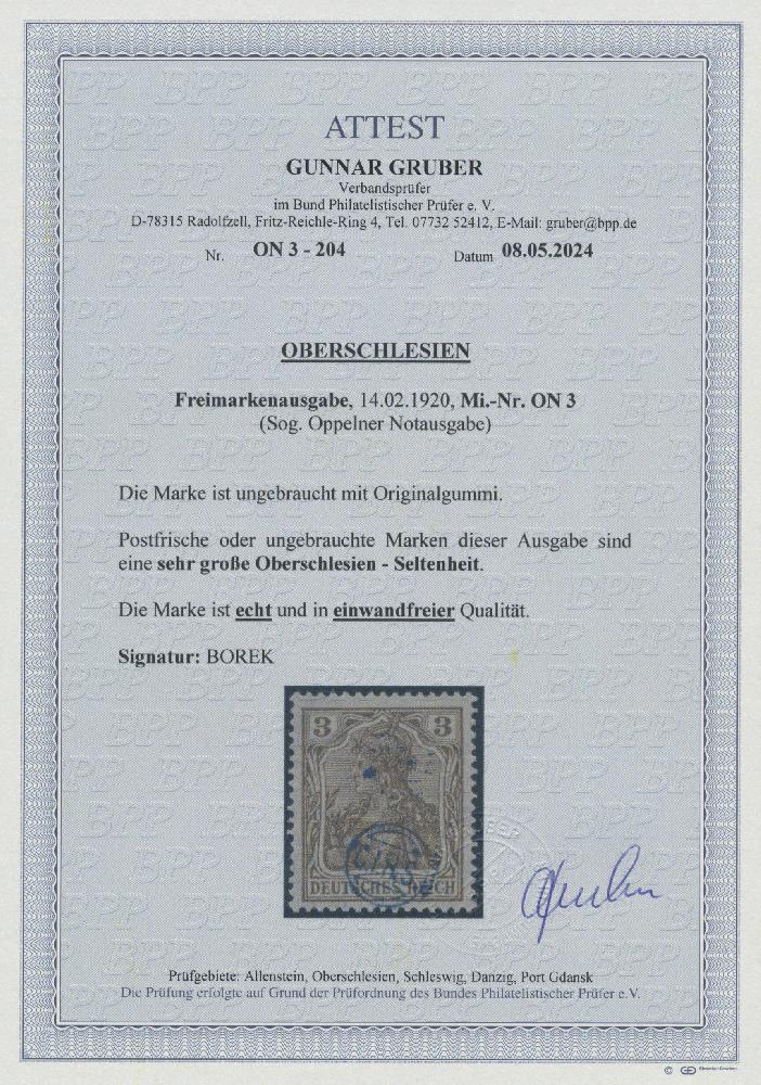 | Zusatzinformationen und Suchstichworte: | Christoph Gärtner 60. Auktion 14. - 18. Oktober 2024 Los 7269 Ost-Oberschlesien, Insurgenten 1920, Handstempelaufdruck, 3 Pfg., ungebraucht, sign. Borek, Foto-Attest Gruber BPP (2024):"echt und einwandfrei", eine sehr seltene Marke, Mi ohne Preis Ausruf 1.200,00 EUR |