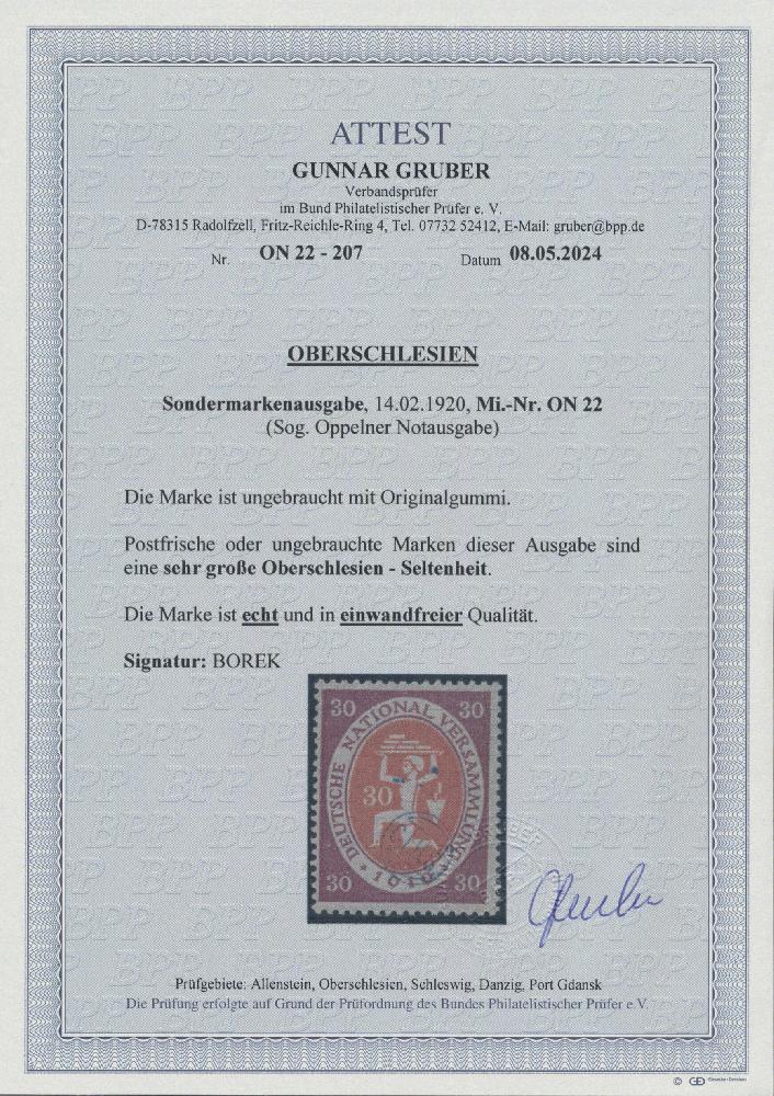 | Zusatzinformationen und Suchstichworte: | Christoph Gärtner 60. Auktion 14. - 18. Oktober 2024 Los 7289 Ost-Oberschlesien, Insurgenten 1920, Handstempelaufdruck, Nationalversammlung, 30 Pfg., ungebraucht, sehr seltene Marke, sign. Borek, Foto-Attest Gruber BPP (2024): "echt und einwandfrei", Mi 1500,- Ausruf 600,00 EUR |
