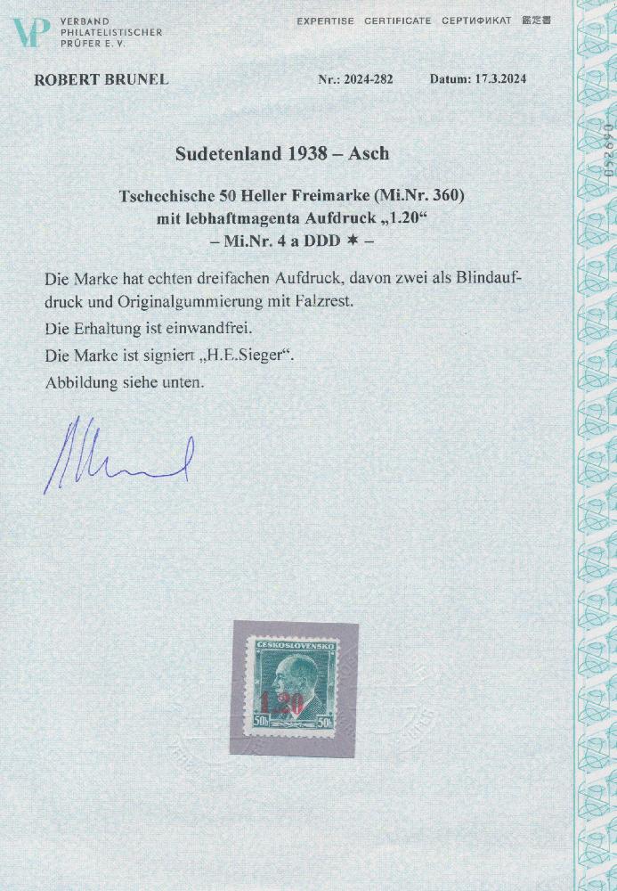 | Zusatzinformationen und Suchstichworte: | Christoph Gärtner 60. Auktion 14. - 18. Oktober 2024 Los 7480 Sudetenland Asch 1938, Tschechische Freimarke 50 H mit Aufdruck 1.20 in lebhaftmagenta , ungebrauccht mit dreifachem Aufdruck, davon zwei als Blinddruck. Mit aktuellem Foto-Attest Brunel VP(2024): "Originalgummi mit Falzrest, echt und einwandfrei". RRR! Ausruf 100,00 EUR |