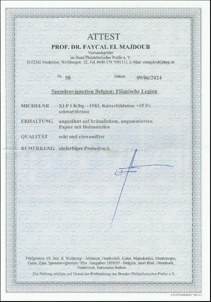 | Zusatzinformationen und Suchstichworte: | Heinrich Köhler 384. Auktion 19./20., 23. - 28. September 2024 Los 3139 Deutsche Besetzung II. WK Belgien Flämische Legion 1943, Kaiserbildnisse 15 Fr. schwarzbraun, einfarbiger Rastertiefdruck auf bräunlichem, ungummierten Papier, sehr selten, tadellos Ausruf 150,00 EUR |