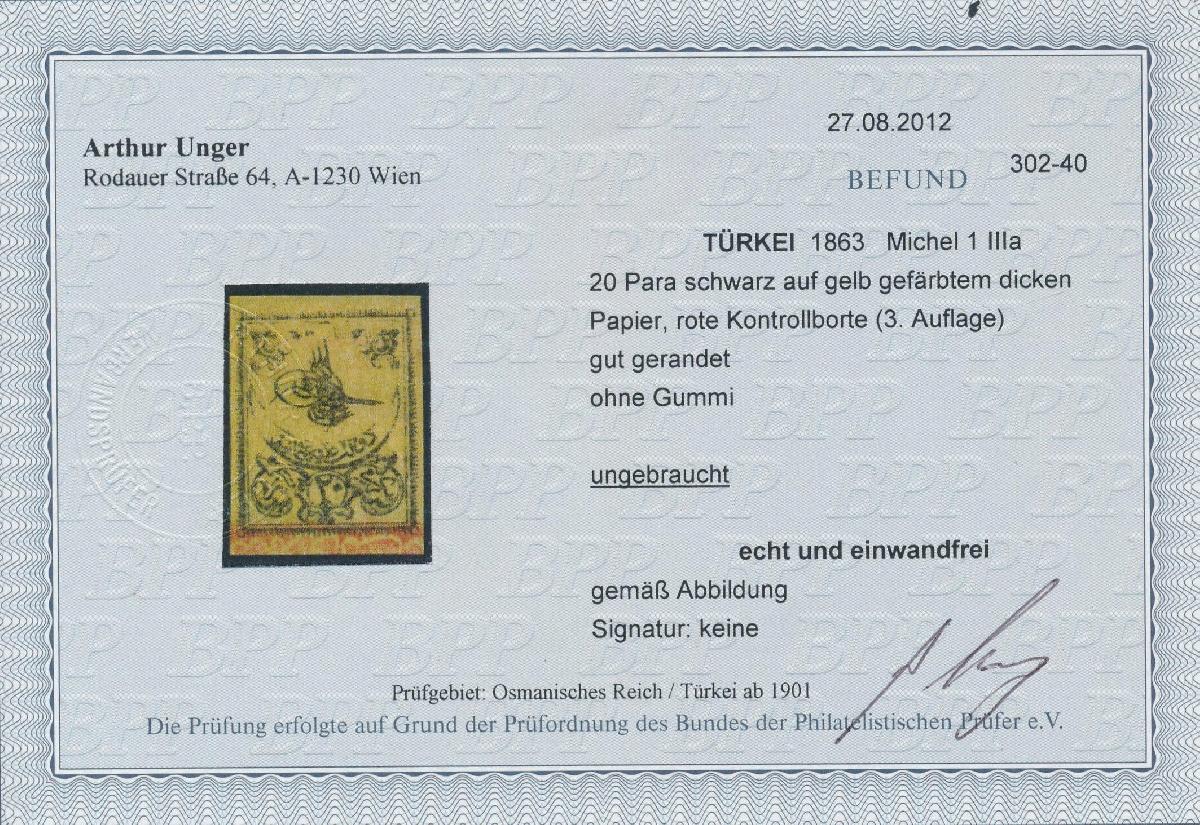 | Zusatzinformationen und Suchstichworte: | Tyrol Phila - Webshop Los 26190 Türkei 1863, 20 Para schwarz auf gelb, gefärbtes dickes Papier mit roter Kontrollborte, 3. Auflage, ungebraucht, gut gerandet, Befund Unger. Mi 1 III a / ISF 19 Festpreis 100,00 EUR |