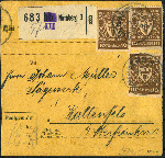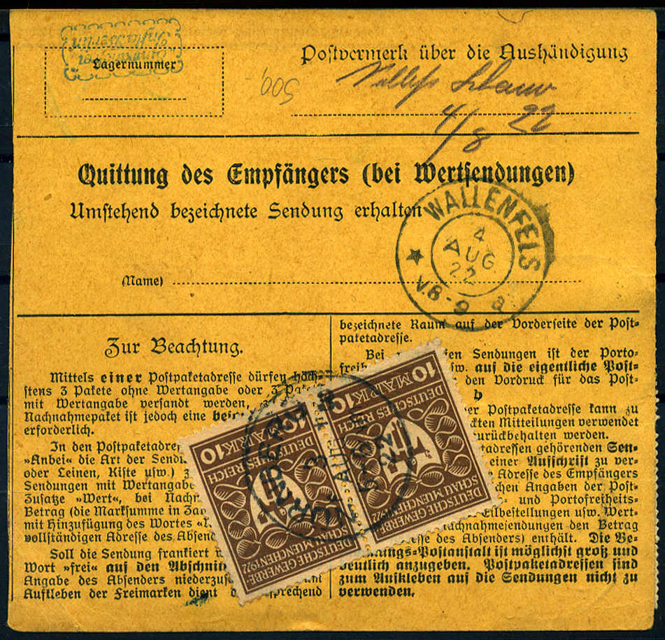 | Zusatzinformationen und Suchstichworte: | AAK Phila GmbH 83. Auktion 13. September 2024 Los 2034 Deutsches Reich, 1918/23 Inflationsausgaben 10 M lilabraun 5x beids. (1x w.Paar) a. Paketkarte v. Nürnberg n. Wallenfels, gepr. u. einwandfreies FA Gaedicke BPP, sehr seltene Massen-MeF! Ausruf 300,00 EUR |