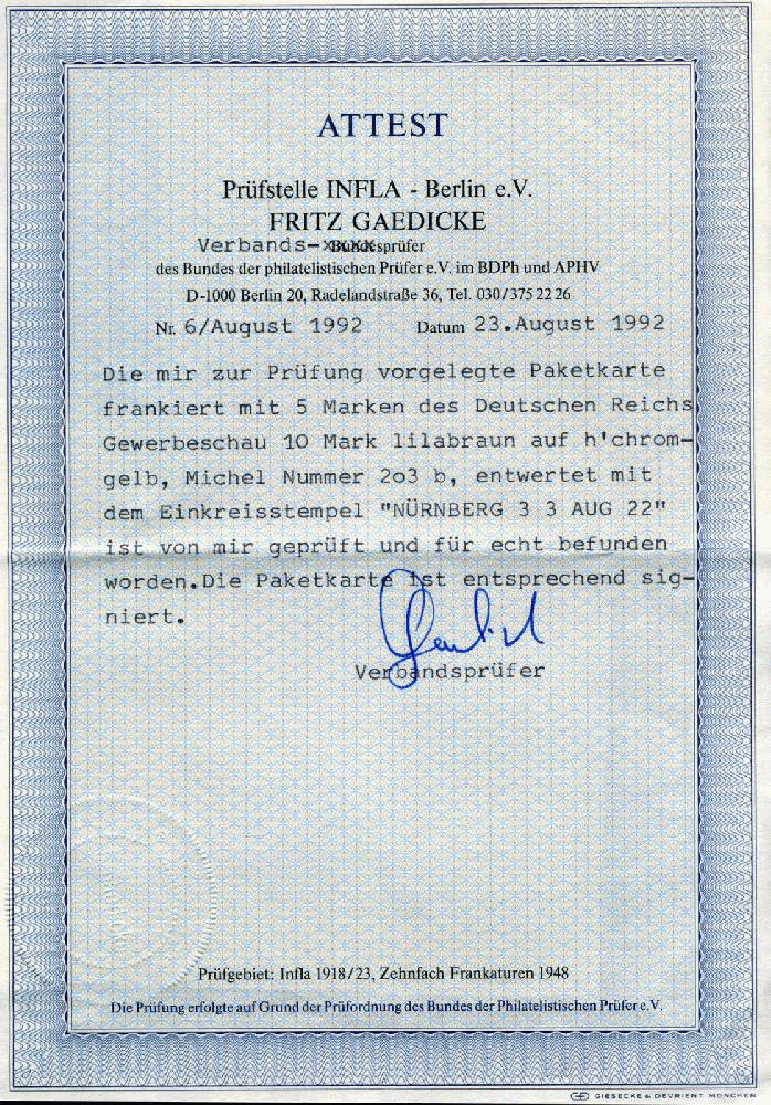 | Prüfgebiet: | Deutsches Reich 1919 - 1923 (Mi-Nr. 107 - 343) |