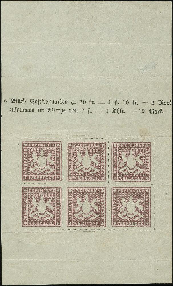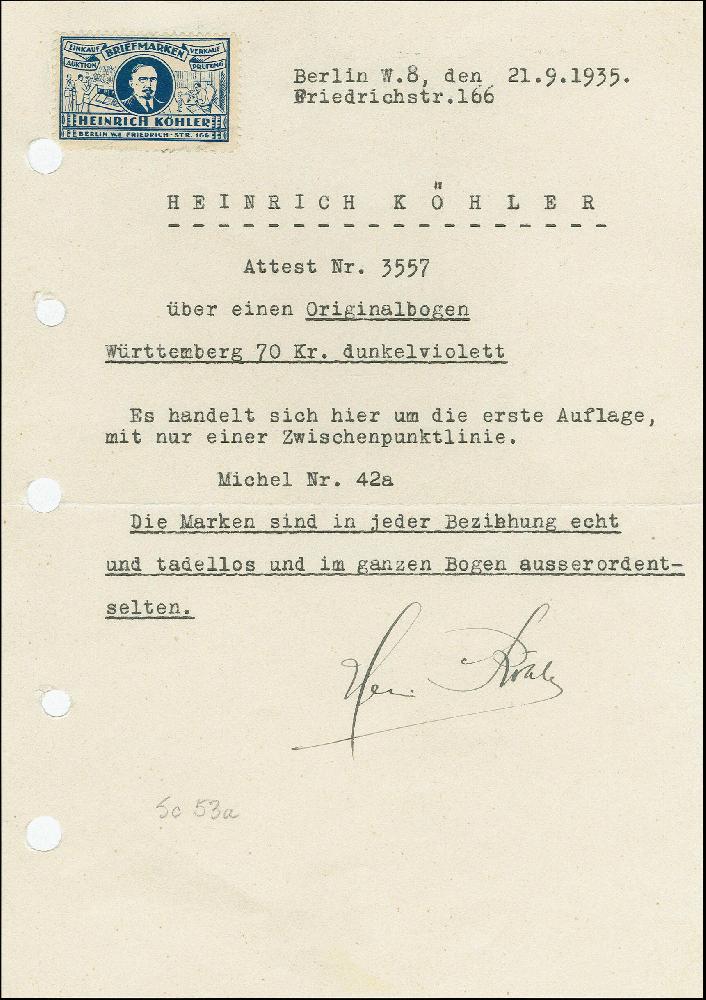 | Zusatzinformationen und Suchstichworte: | Heinrich Köhler 384. Auktion 19./20., 23. - 28. September 2024 Los 8121 Altdeutschland Württemberg 70 Kreuzer braunlila, Schalterbogen mit sechs Marken, Bogenrändern und Randinschrift. Vollständige Höhe, in der Breite etwas beschnitten. Die Marken mit frischem Originalgummi, teils postfrisch, und alle tadellos. Im Bogenrand diverse Falze, teils zur Stützung der üblichen waagerechten Büge, sowie kleine falzhelle Stellen. Eine der großen Seltenheiten der Württemberg-Philatelie, wir haben nur 3 weitere Bögen der 1. Auflage registriert, davon 2 Stück stärker beschnitten. Im Unterrand in Bleistift kleine Kaufnotiz über 650 Goldmark von Philipp Kosack, 1906, ansonsten unsigniert. Ausruf 25.000,00 EUR |