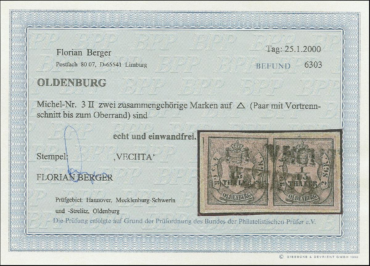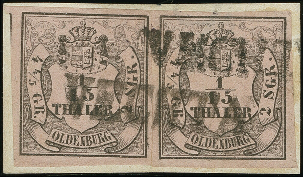 | Zusatzinformationen und Suchstichworte: | Heinrich Köhler 384. Auktion 19./20., 23. - 28. September 2024 Los 4156 Altdeutschland Oldenburg 1/15 Th. auf mattbräunlichrot, Type II, waagerechtes Paar mit langem Vortrennschnitt, farbfrisch und voll- bis überrandig, mit schwarzem L1 "VECHTA" auf kleinem Briefstück. Tadellos. Paare dieser Marke sind sehr selten. Ausruf 200,00 EUR |