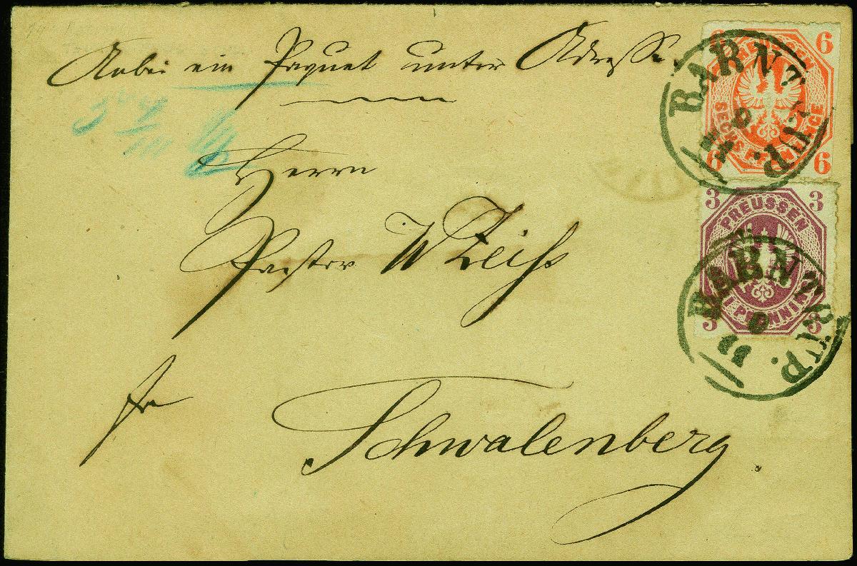 | Zusatzinformationen und Suchstichworte: | Heinrich Köhler 384. Auktion 19./20., 23. - 28. September 2024 Los 7605 Altdeutschland Preussen "BARNTRUP 9/11" (1867), EKr. sauber auf Preußen 3 Pfg. dunkelpurpur und 6 Pfg. orange (gering oxydiert), auf kleinem Paketbegleitbrief (Viertelbogen) nach Schwalenberg. Die 6 Pfg. rechts Scherentrennung, sonst einwandfrei. Ausruf 200,00 EUR |