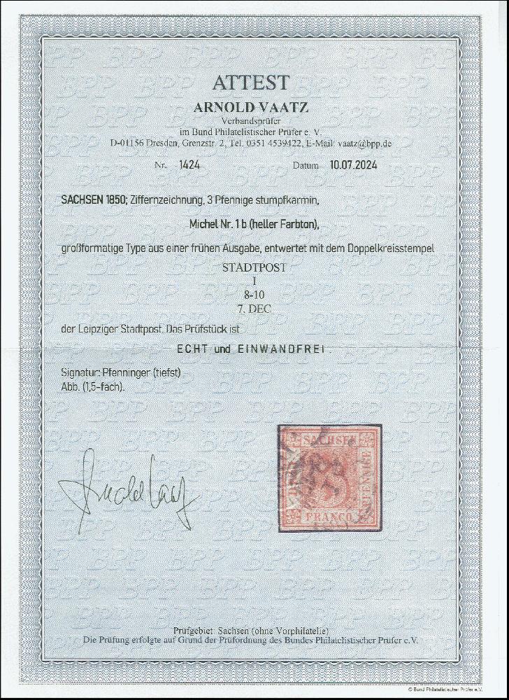 | Zusatzinformationen und Suchstichworte: | Heinrich Köhler 384. Auktion 19./20., 23. - 28. September 2024 Los 4194 Altdeutschland Sachsen 3 Pfg. kirschrot (wahrscheinlich Platte II, Type 7), heller Farbton, farbfrisch und allseits gleichmäßig gut gelandet, entwertet durch DKr. "STADTPOST I 7.DEC". Ein schönes Stück der seltenen Farbe in tadelloser Erhaltung. Ausruf 3.000,00 EUR |