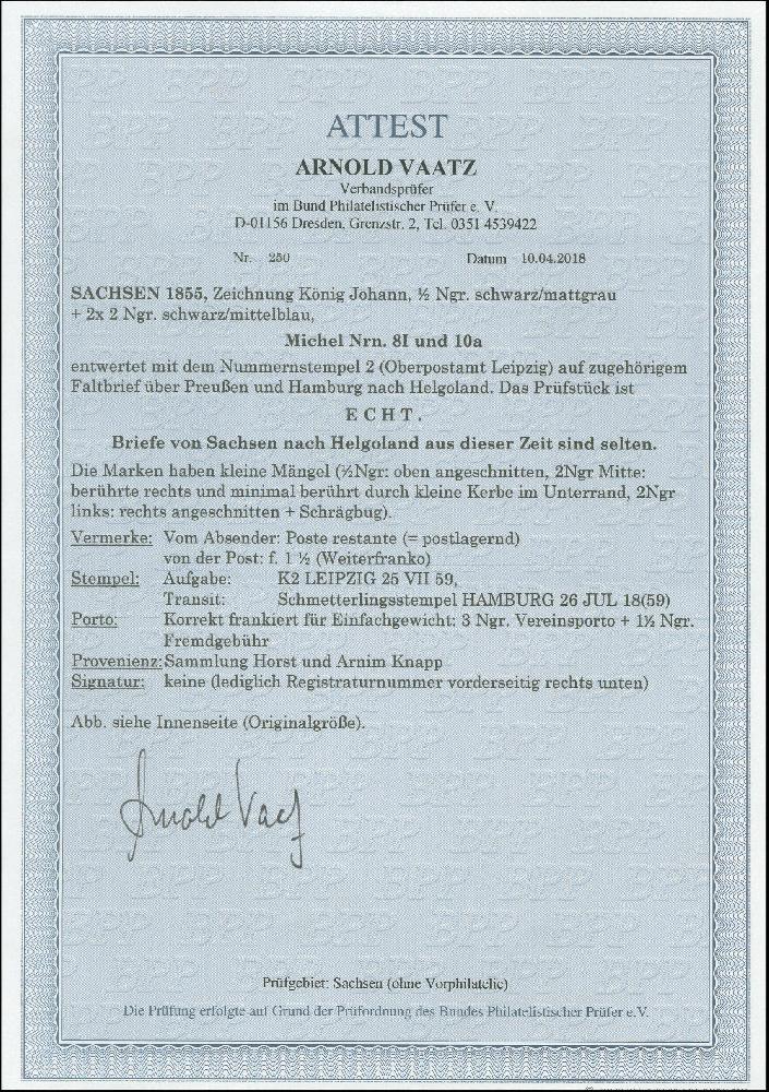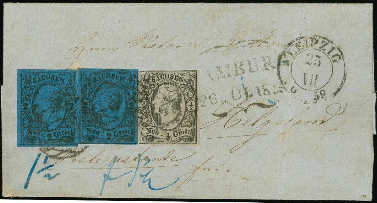 | Zusatzinformationen und Suchstichworte: | Heinrich Köhler 384. Auktion 19./20., 23. - 28. September 2024 Los 7314 Altdeutschland Sachsen 1855/63, Johann ½ Neugroschen auf grau und zwei Einzelwerte 2 Ngr. auf blau, teils leicht berührt, jedoch meist voll- bis breitrandig mit Nr. "2" und nebengesetztem DKr. "LEIPZIG 25 VII 59" auf kleiner Briefhülle mit Teil des Inhaltes nach Helgoland, "Poste restante", mit vorderseitigem Schmetterlingsstempel "HAMBURG 28 JUL. 1859"; das Weiterfranko von "1½" Neugroschen vorder- und rückseitig vermerkt; durch die linke 2 Ngr. leichte senkrechte Bugspur, sonst gute und ursprüngliche Erhaltung; ein attraktiver Brief Ausruf 800,00 EUR |