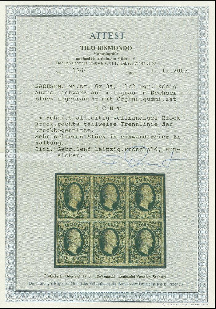 | Zusatzinformationen und Suchstichworte: | Heinrich Köhler 384. Auktion 19./20., 23. - 28. September 2024 Los 7516 Altdeutschland Sachsen ½ Neugroschen auf mattgrau, waagerechter 6er-Block, farbfrisch und voll- bis breitrandig, rechts mit senkrechter Trennungslinie, ungebraucht mit Originalgummi. Eine große Seltenheit. Größte registrierte Einheit dieser Marke mit Originalgummi Ausruf 2.000,00 EUR |