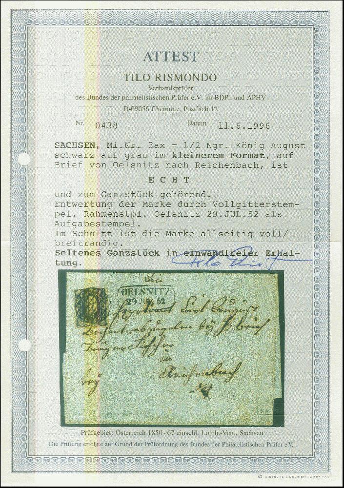 | Zusatzinformationen und Suchstichworte: | Heinrich Köhler 384. Auktion 19./20., 23. - 28. September 2024 Los 7521 Altdeutschland Sachsen ½ Neugroschen auf mattgrauem dünnen Maschinenpapier, dadurch Bildformat ca. 0,7 mm niedriger, voll- bis breitrandig, mit sauber aufgesetztem Rothstempel und nebengesetztem Rahmenstempel "OELSNITZ 29 JUL.52" auf komplettem Faltbrief nach Reichenbach. Eine auf Brief sehr seltene Abart; wir haben nur 2 weitere Briefe registriert (beide nicht einwandfrei) Ausruf 800,00 EUR |