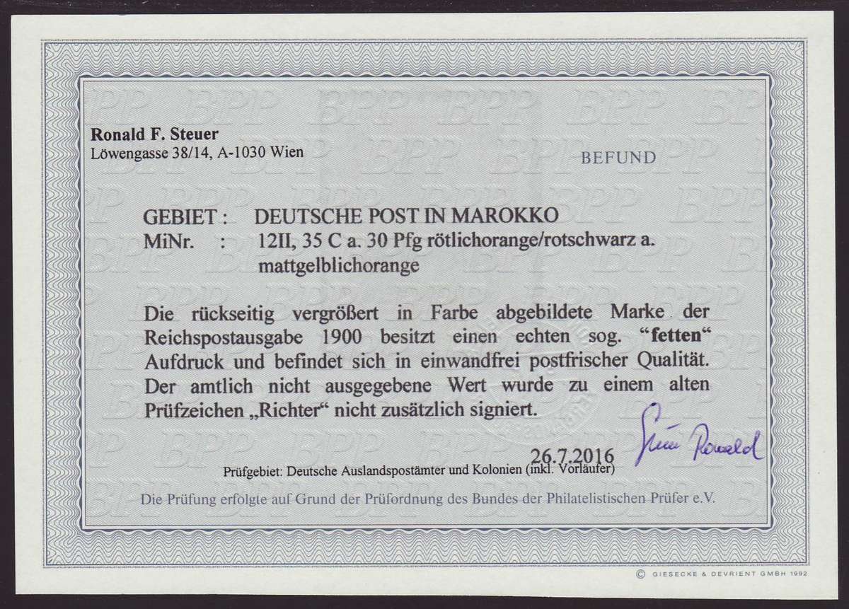 | Zusatzinformationen und Suchstichworte: | Christian E. Geigle Briefmarkenfachhandel Los 0003132790 Deutsche Auslandspost Marokko 1903, Germania Reichspost mit sog. "fettem" Aufdruck "Marocco", 35 C. auf 30 Pf. rötlichorange/rotschwarz auf mattgelblichorange, amtlich nicht ausgegeben (Auflage nur 171 Stück!), postfrisches Luxusstück, FB Steuer "einwandfrei". Festpreis 245,00 EUR |