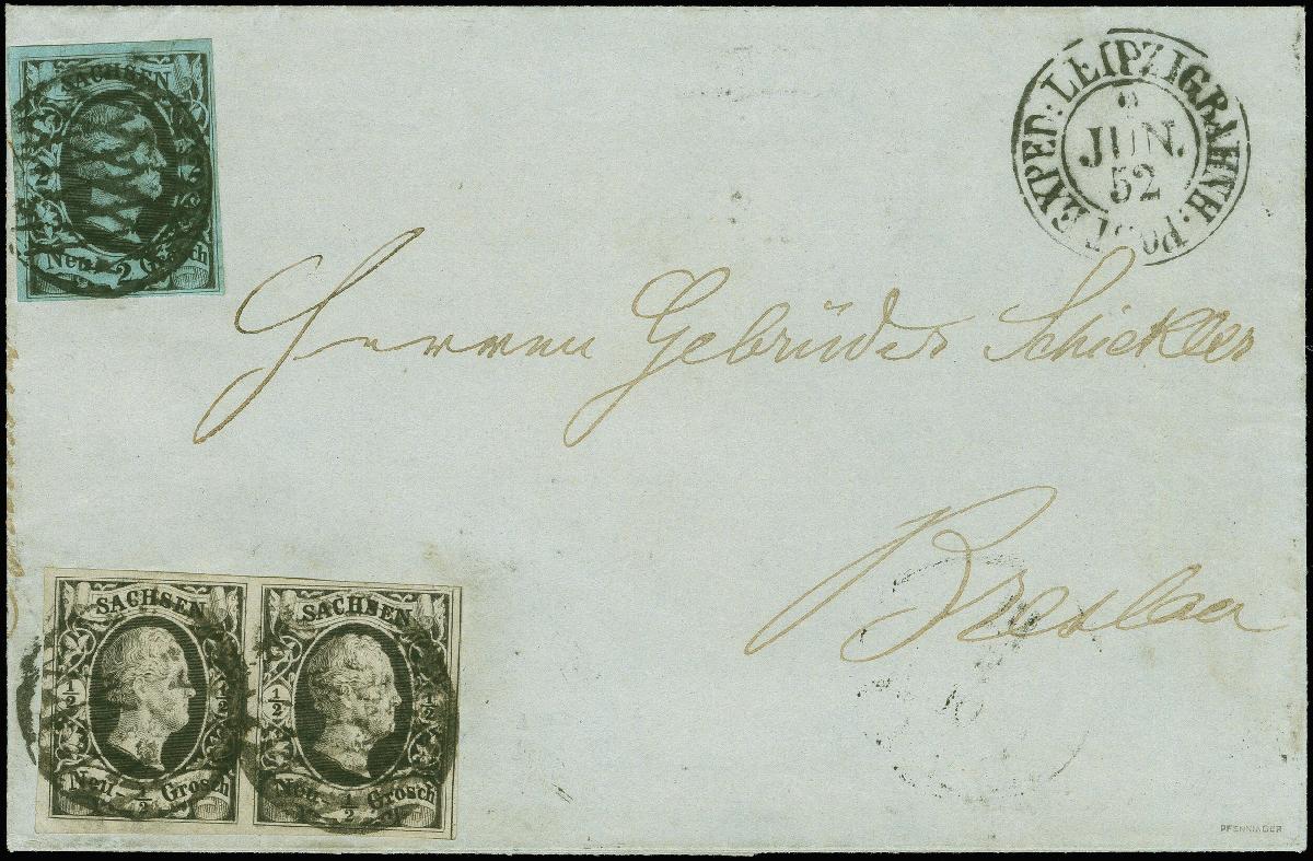 | Zusatzinformationen und Suchstichworte: | Heinrich Köhler 384. Auktion 19./20., 23. - 28. September 2024 Los 7532 Altdeutschland Sachsen ½ Neugroschen auf grau im waagerechten Paar und 2 Neugroschen auf mattpreußischblau, alle farbfrisch und voll- bis meist breitrandig, mit Vollgitterstempel und nebengesetztem DKr. "LEIPZIG 9 JUN 52" auf Briefhülle nach Breslau. Schöne und einwandfreie Erhaltung. Außerordentlich selten; wir haben diese Frankaturkombination nur noch zweimal registriert. Ausruf 800,00 EUR |