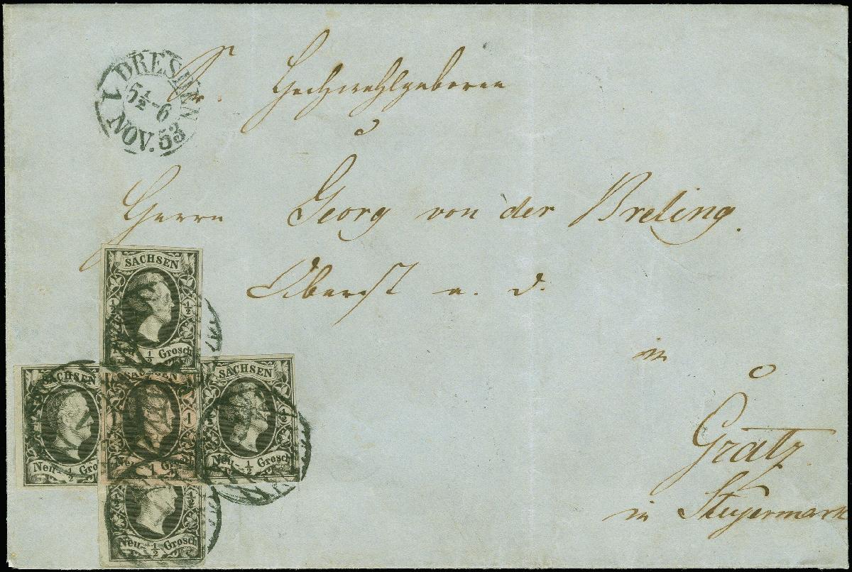 | Zusatzinformationen und Suchstichworte: | Heinrich Köhler 384. Auktion 19./20., 23. - 28. September 2024 Los 7530 Altdeutschland Sachsen ½ Neugroschen auf mattgrau, 4 Einzelwerte, zusammen mit 1 Neugroschen auf mattgraurot, alle breitrandig geschnitten und kreuzförmig geklebt, mit Vollgitterstempel und nebengesetztem Aufgabestempel "DRESDEN 1 NOV. 53" auf Briefkuvert nach Graz in Österreich. Die 1 Neugroschen links unmerklicher kleiner Einriß, sonst einwandfrei. Eine äußerst seltene Frankatur Kombination mit einmalige Optik. Ausruf 2.000,00 EUR |