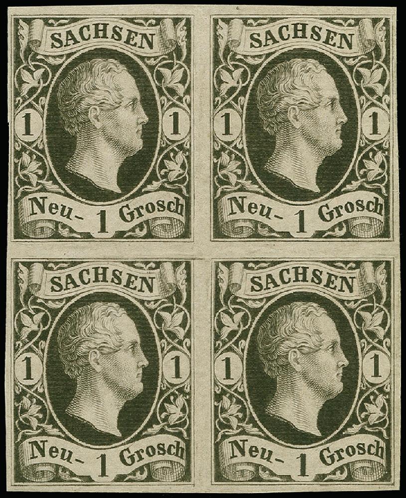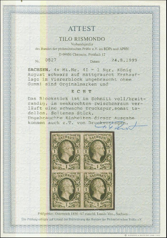 | Zusatzinformationen und Suchstichworte: | Heinrich Köhler 384. Auktion 19./20., 23. - 28. September 2024 Los 7546 Altdeutschland Sachsen 1 Neugroschen auf mattgraurot in der seltenen Type I im Viererblock, allseits breitrandig und farbfrisch, ungebraucht ohne Gummi. Im senkrechten Zwischenraum ganz schwache Druckspur, sonst tadellos. Eine außerordentlich seltene Einheit; wir haben außer einem Achterblock kein weiteres Blockstück dieser Marke registriert Ausruf 800,00 EUR |