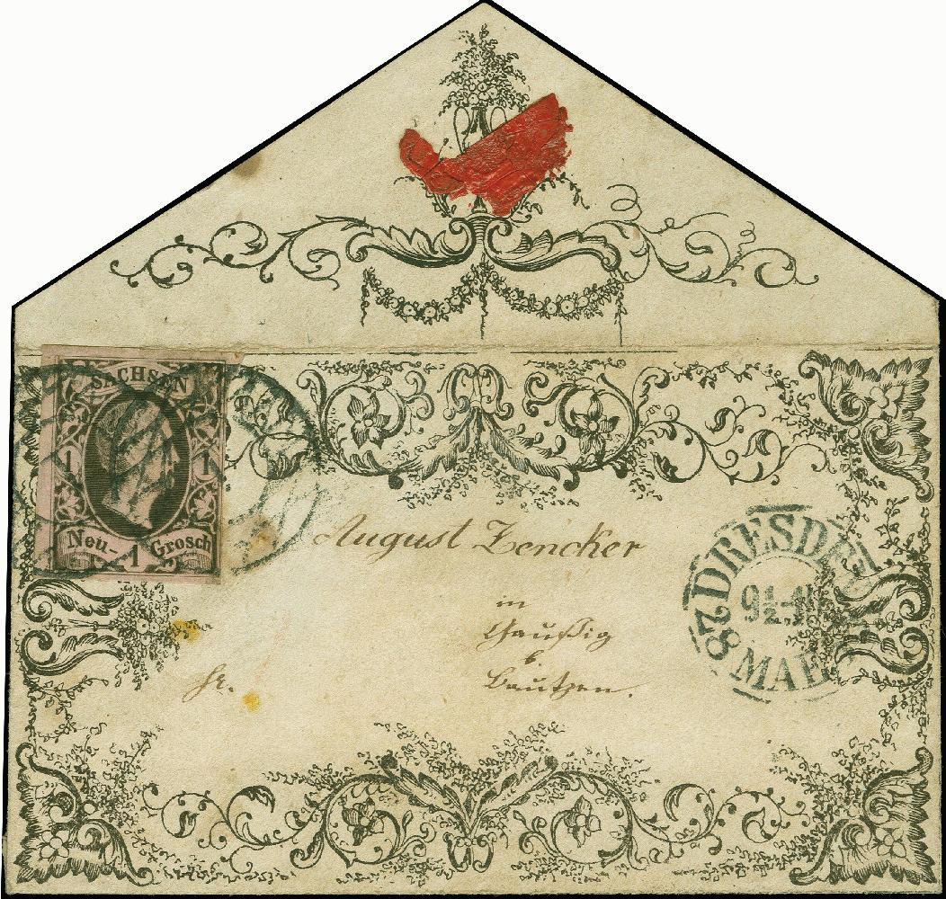 | Zusatzinformationen und Suchstichworte: | Heinrich Köhler 384. Auktion 19./20., 23. - 28. September 2024 Los 7556 Altdeutschland Sachsen 1 Neugroschen auf mattgraurot, rechts voll- sonst breitrandig, mit Nr. "1" und sauber nebengesetztem DKr. "DRESDEN 28 MAE 5?" auf ungewöhnlich aufwendig bedrucktem Damenkuvert nach Bautzen. Ein besonders attraktiver Zierbrief in sehr schöner Erhaltung Ausruf 1.000,00 EUR |