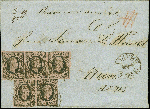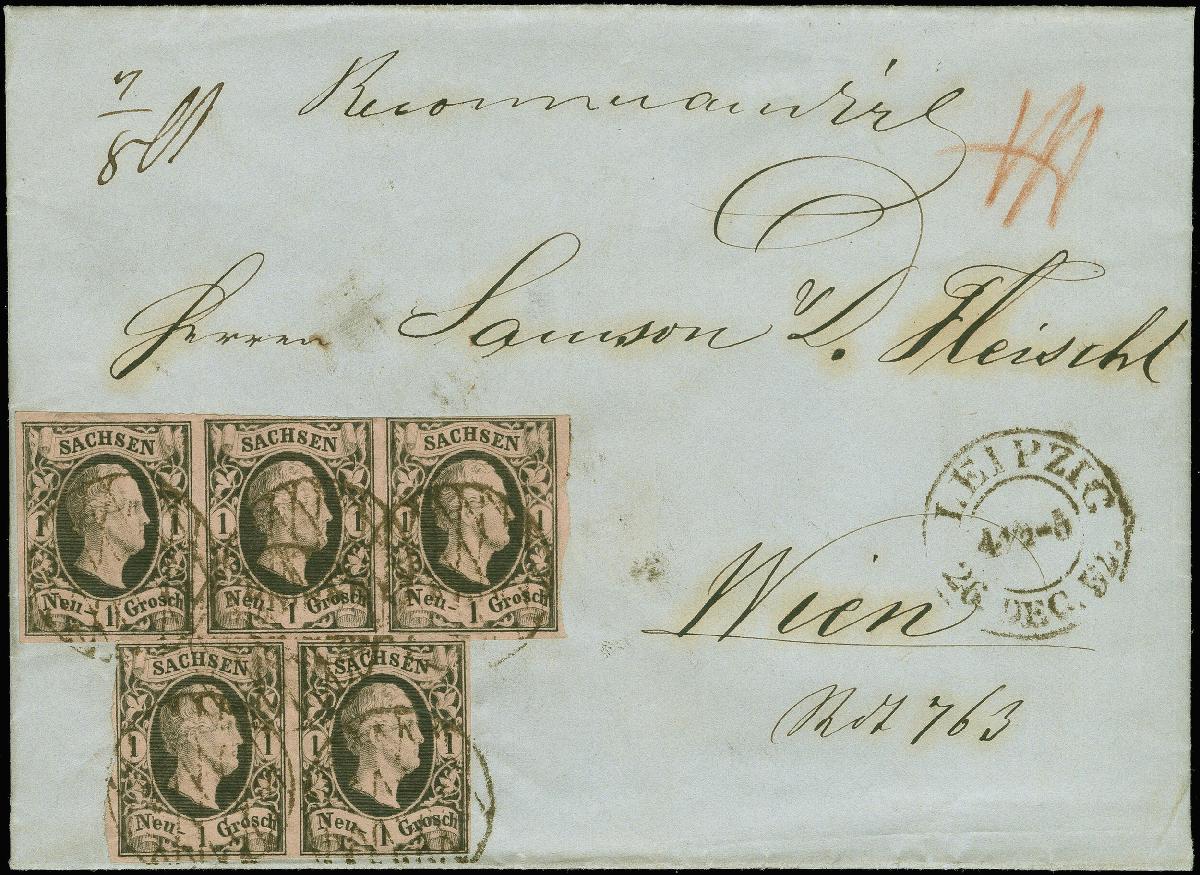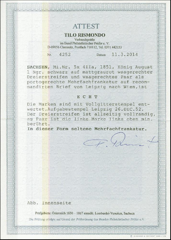 | Zusatzinformationen und Suchstichworte: | Heinrich Köhler 384. Auktion 19./20., 23. - 28. September 2024 Los 7559 Altdeutschland Sachsen 1 Neugroschen auf mattgraurot, waagerechter 3er-Streifen, voll- bis meist breitrandig, mit links leicht berührtem waagerechten Paar, mit Vollgitterstempel und sauber nebengesetztem DKr. "LEIPZIG 26.DEC. 52" auf komplettem recommandirtem Faltbrief nach Wien. Eine außerordentlich seltene und attraktive Mehrfachfrankatur; wir haben keine weitere derartige registriert. Ausruf 1.000,00 EUR |