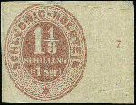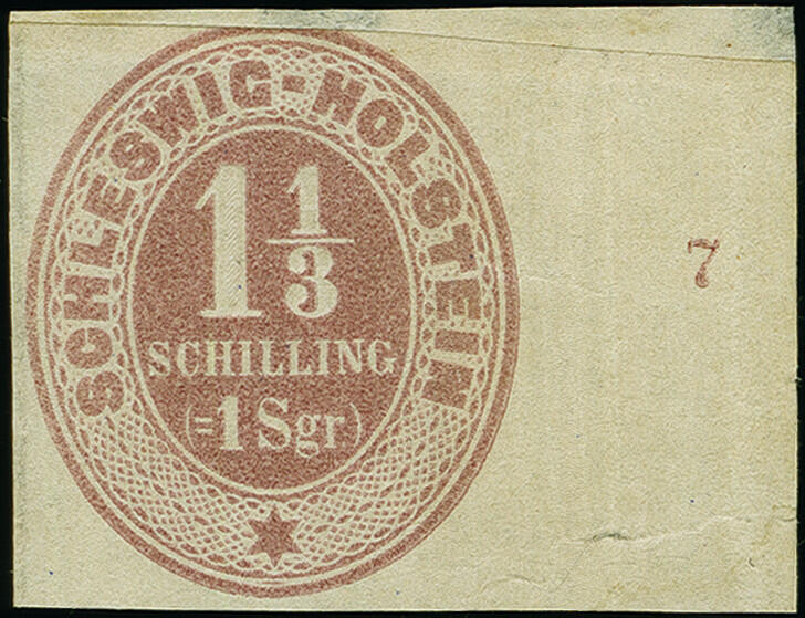 | Zusatzinformationen und Suchstichworte: | Heinrich Köhler 384. Auktion 19./20., 23. - 28. September 2024 Los 4209 Altdeutschland Schleswig Holstein 1⅓ Schilling violettbraun ohne Durchstich, rechtes Randstück mit Reihenzähler "7", ungebraucht ohne Gummi. Die Marke ist oben etwas angeschnitten und hier hinterlegt, etwas knittrig und mit Papierspalt im Bogenrand. Eine seltene Abart, nur wenige Stücke bekannt Ausruf 200,00 EUR |