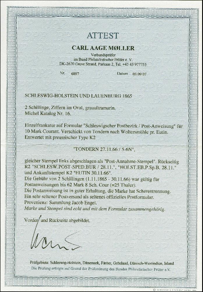 | Zusatzinformationen und Suchstichworte: | Heinrich Köhler 384. Auktion 19./20., 23. - 28. September 2024 Los 4210 Altdeutschland Schleswig Holstein 2 Schilling grauultramarin, links Scherentrennung, mit etwas verwischt und sauber nebengesetztem Doppelkreisstempel "TONDERN 27 11 66" auf kompletter Postanweisung über 10 Mark nach Woltersmühle bei Eutin, mit Transit- und Ankunftsstempeln. Schöne und sonst einwandfreie Erhaltung, ungefaltet. Ausruf 340,00 EUR |
