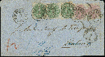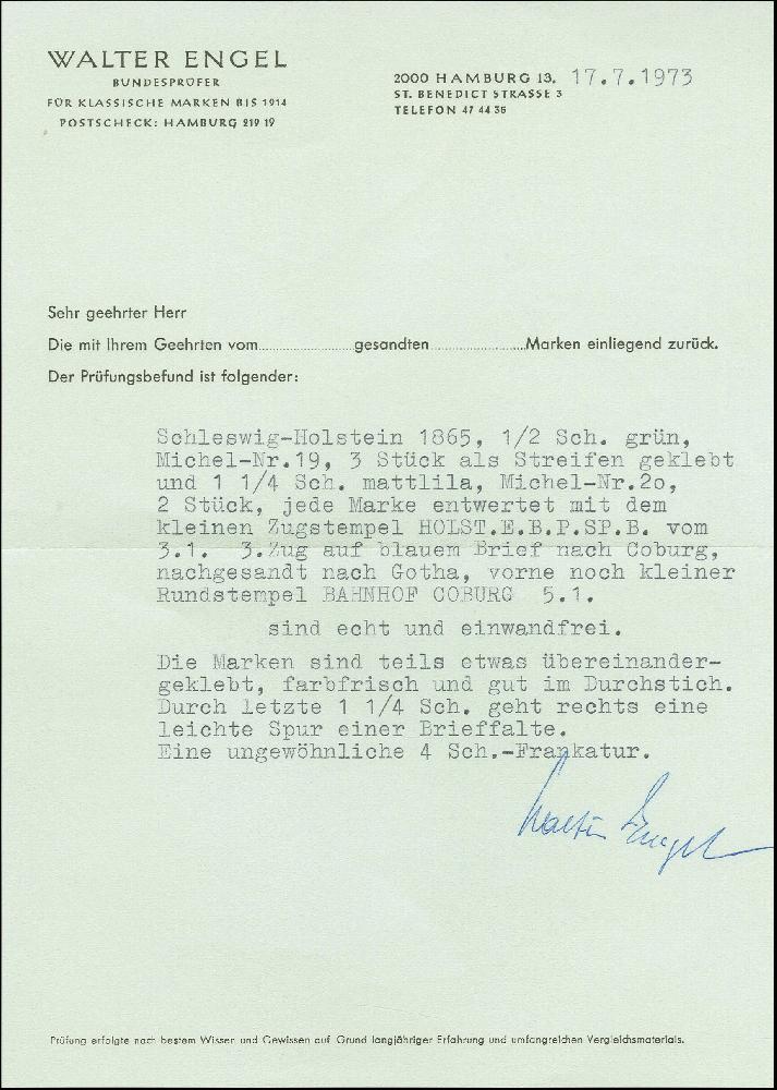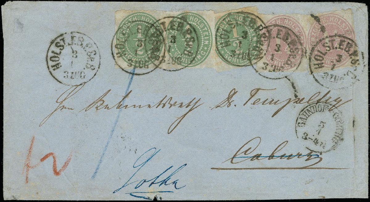 | Zusatzinformationen und Suchstichworte: | Heinrich Köhler 384. Auktion 19./20., 23. - 28. September 2024 Los 4211 Altdeutschland Schleswig Holstein 1865, farbiger Grund, 3 Einzelwerte ½ Sch. Grünoliv mit 2 Werten 1¼ Sch. lebhaftbraunpurpur, mit Bahnpost-EKr. "HOLST:EB.P.SP.B. 3/1" nach Coburg, und mit nebengesetztem EKr. "BAHNHOF COBURG 5 1" nachgesandt nach Gotha. Leichte Altersspuren und etwas gereinigt, die rechte Marke kleine Bugspur im rechten unteren Rand. Eine äußerst seltene Frankaturkombination Ausruf 150,00 EUR |